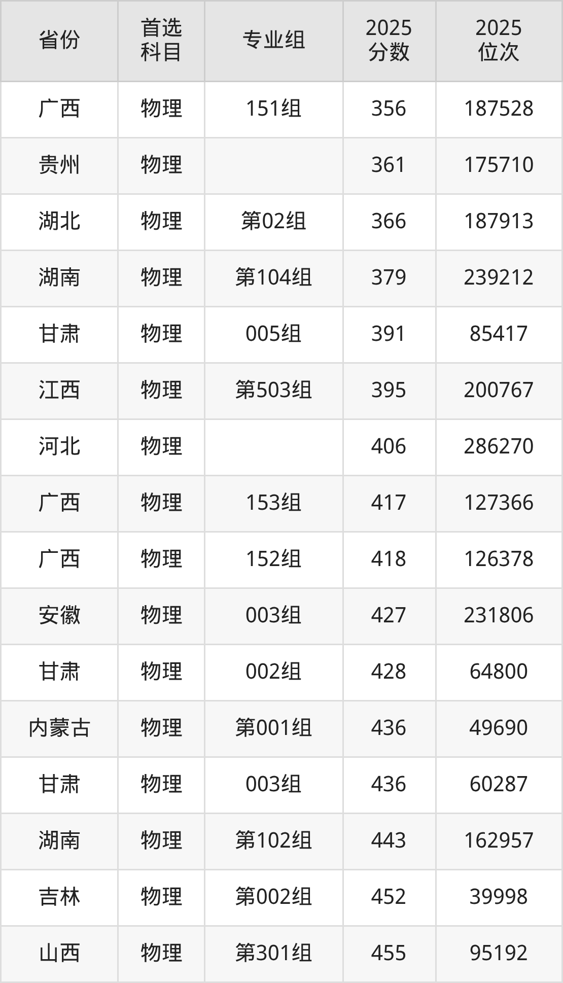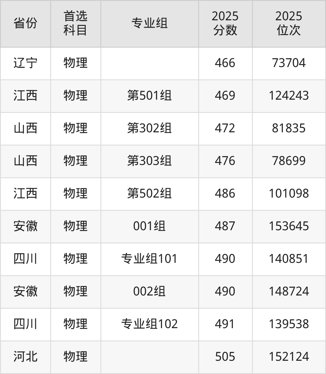 物理类最低分对应地区为四川(专业组101),录取位次为284789;最高分对应地区为河北,录取位次为152124,超本科线46分。