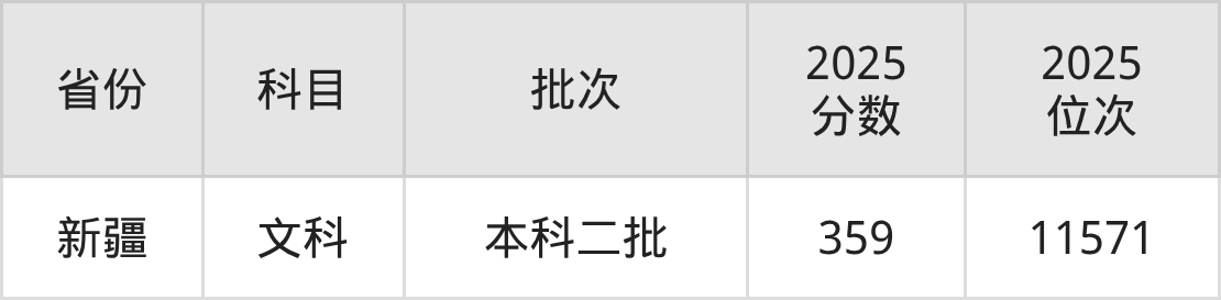 文科最低分对应地区为新疆,录取位次为11571,超二本线29分。