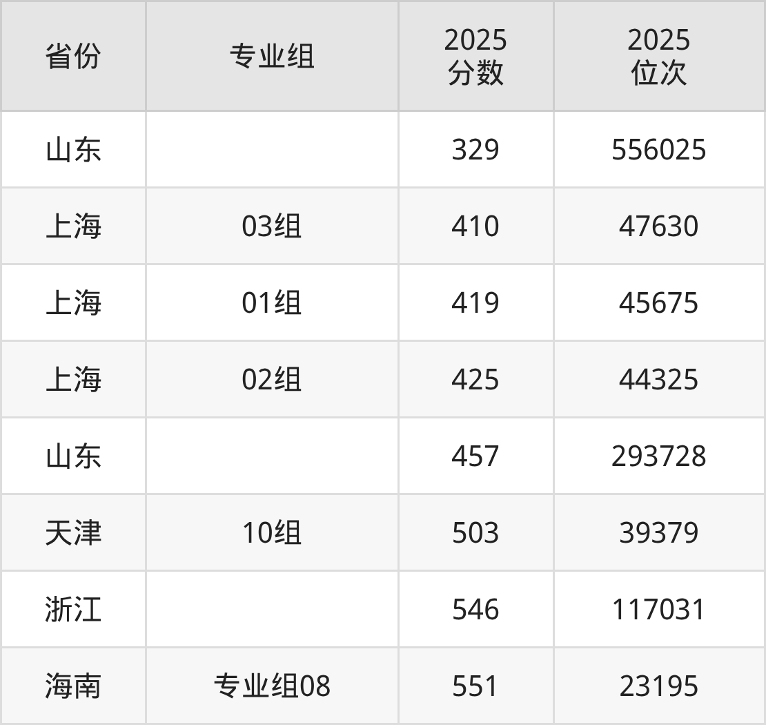 最低分对应地区为山东,录取位次为556025,超二段线179分;最高分对应地区为海南(专业组08),录取位次为23195,超本科线71分。