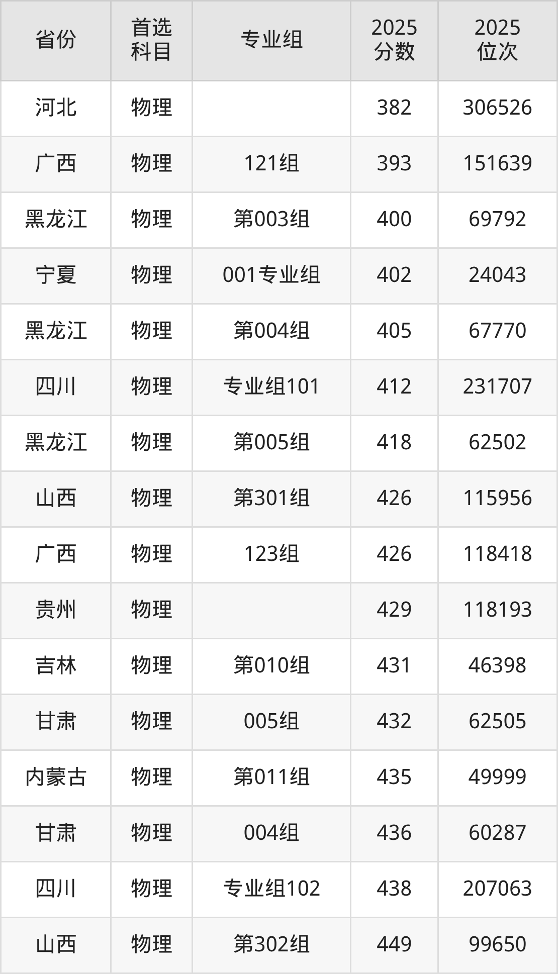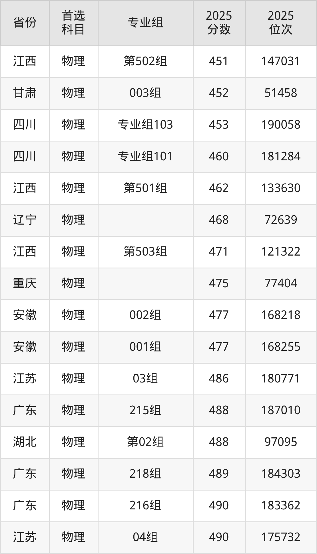 物理类:专业组101412分、231707名,专业组101460分、181284名,专业组102438分、207063名,专业组103453分、190058名;