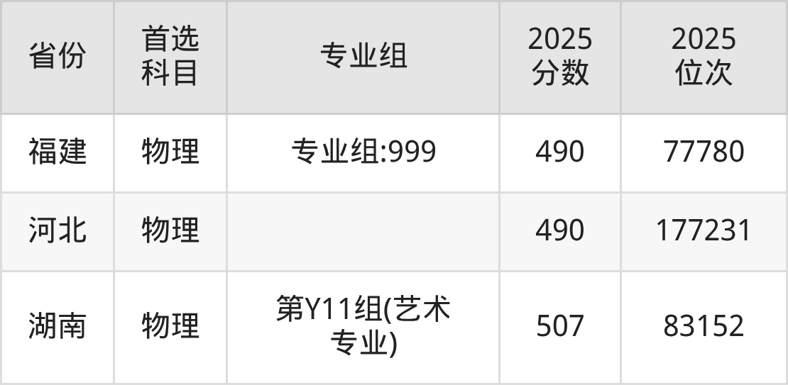 物理类最低分对应地区为重庆,录取位次为129396,超专科线158分;最高分对应地区为湖南(第Y11组(艺术专业)),录取位次为83152,超本科线102分。