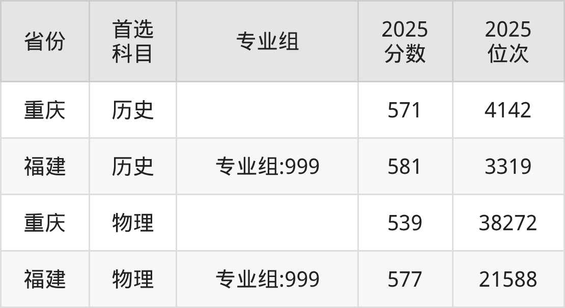 历史类最低分对应地区为重庆,录取位次为4142,超本科线133分;最高分对应地区为福建(专业组:999),录取位次为3319,超本科线131分。
