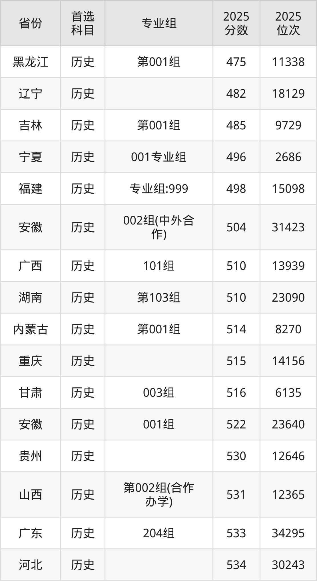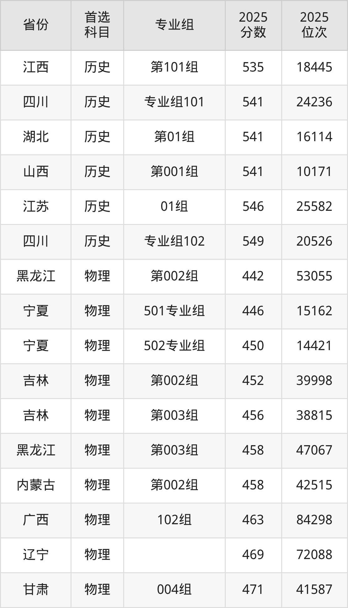 历史类最低分对应地区为黑龙江(第001组),录取位次为11338;最高分对应地区为四川(专业组102),录取位次为20526,超本科B82分。