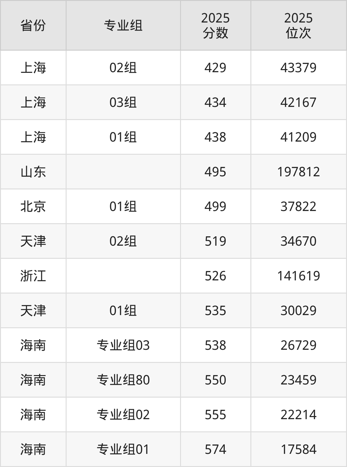 最低分对应地区为上海(02组),录取位次为43379,超本科线27分;最高分对应地区为海南(专业组01),录取位次为17584,超本科线94分。