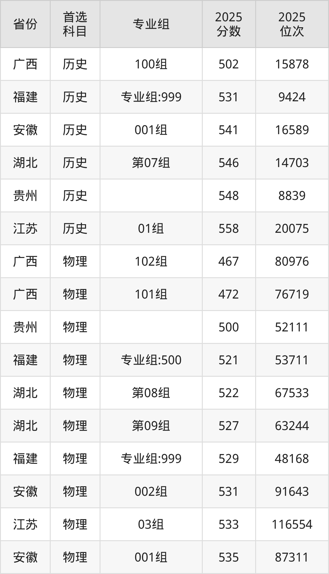 物理类最低分对应地区为广西(102组),录取位次为80976,超本科线97分;最高分对应地区为江苏(02组),录取位次为86192,超本科线92分。