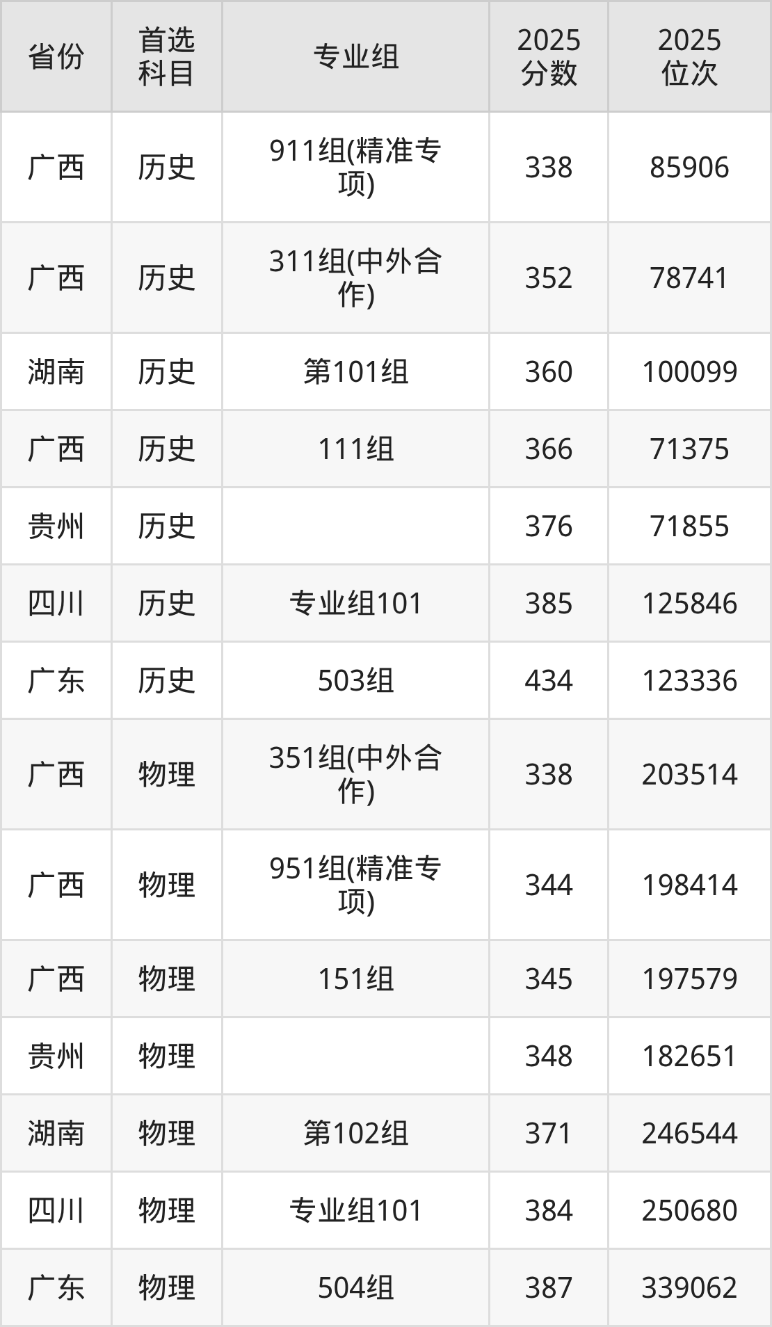 物理类最低分对应地区为广西(351组(中外合作)),录取位次为203514,超专科线138分;最高分对应地区为广东(504组),录取位次为339062,超专科线187分。