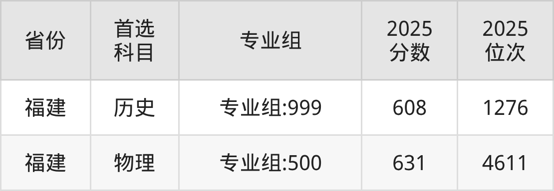 历史类最低分对应地区为福建(专业组:999),录取位次为1276,超本科线158分。