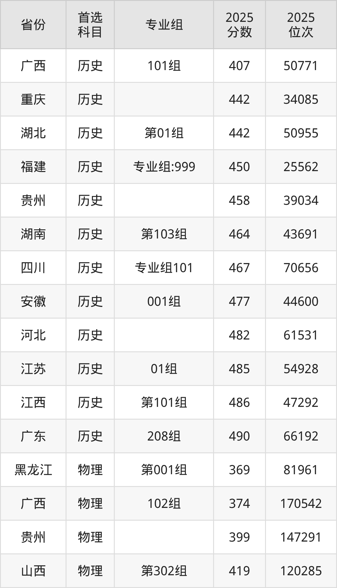 历史类最低分对应地区为广西(101组),录取位次为50771,超本科线5分;最高分对应地区为广东(208组),录取位次为66192,超本科线26分。