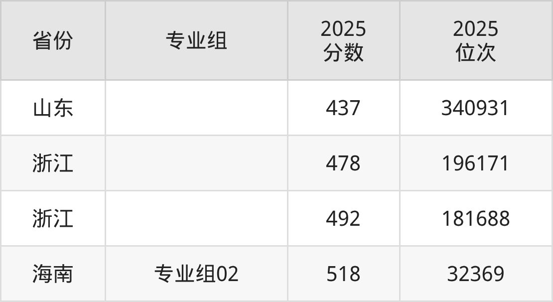 最低分对应地区为山东,录取位次为340931,超一段线28分;最高分对应地区为海南(专业组02),录取位次为32369,超本科线38分。