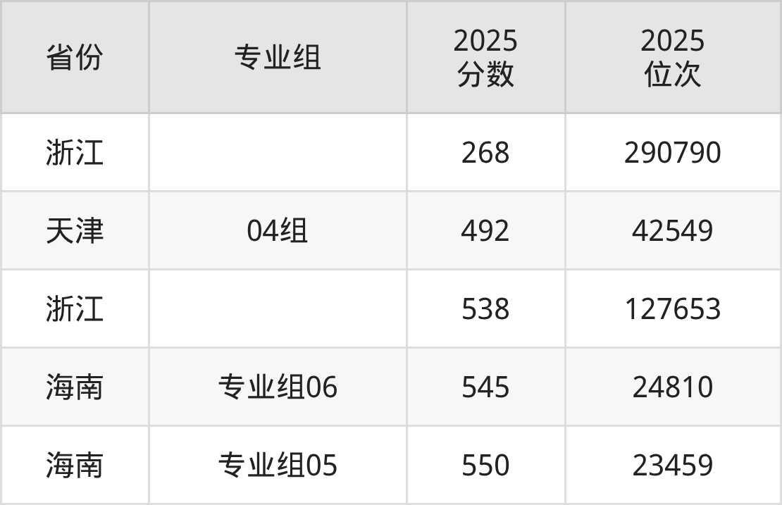 最低分对应地区为浙江,录取位次为290790;最高分对应地区为海南(专业组05),录取位次为23459。