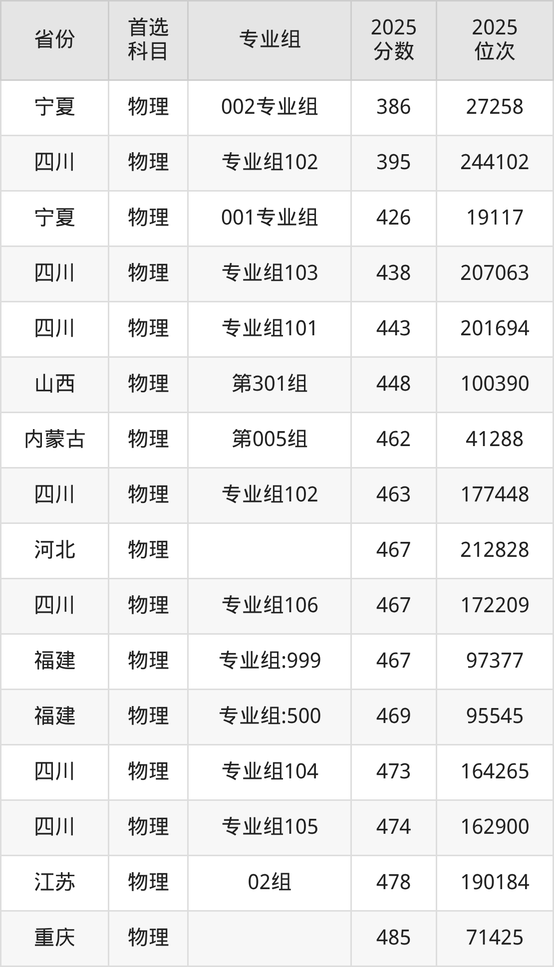 物理类:专业组101382分、251752名,专业组101443分、201694名,专业组102395分、244102名,专业组102463分、177448名,专业组103438分、207063名,专业组104473分、164265名,专业组105474分、162900名,专业组106467分、172209名;