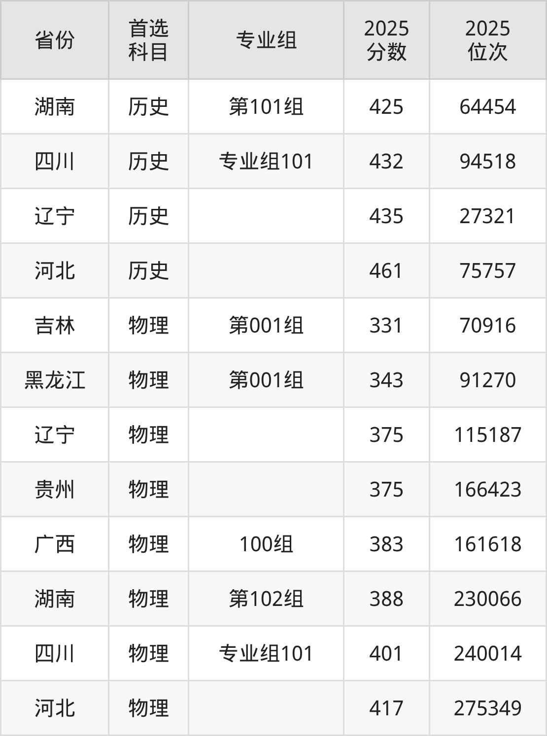 历史类最低分对应地区为湖南(第101组),录取位次为64454,超专科线225分;最高分对应地区为河北,录取位次为75757,超专科线261分。