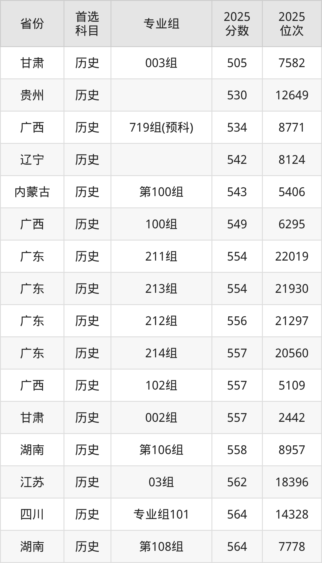 历史类:01组545分、19572名,02组567分、11916名,03组545分、19572名,04组(中外合作)526分、27627名,05组562分、13511名,06组575分、9602名;