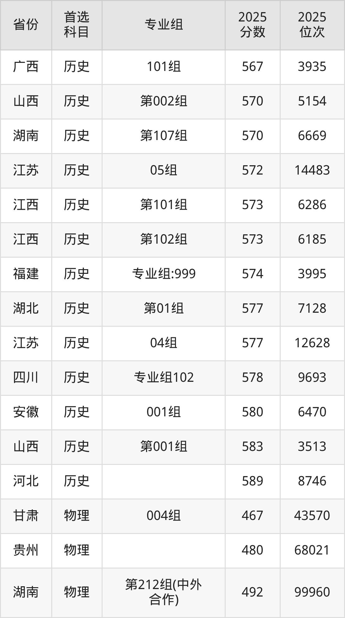 历史类最低分对应地区为甘肃(003组),录取位次为7582,超本科线93分;最高分对应地区为河北,录取位次为8746,超本科线112分。