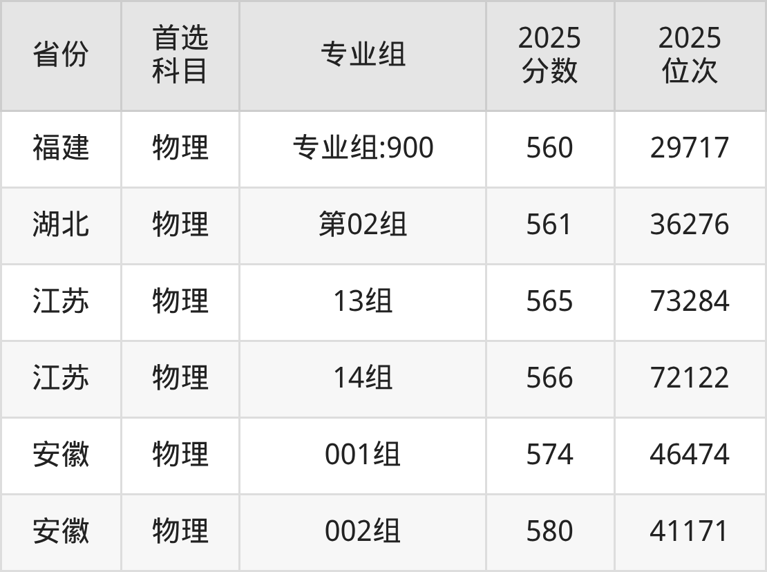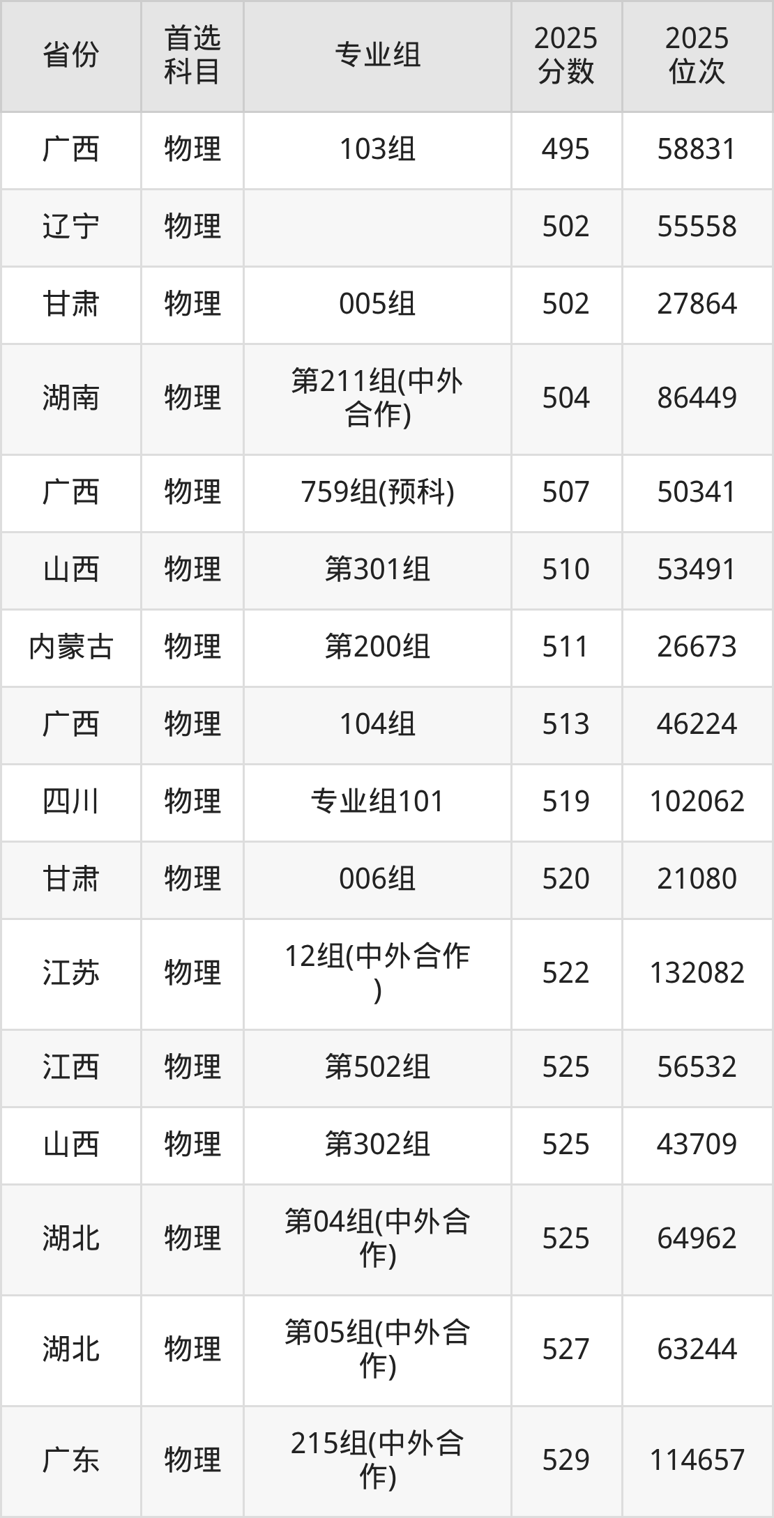 物理类:11组527分、108843名,12组541分、90894名,13组(中外合作)526分、110102名,14组548分、82304名,15组(中外合作)519分、119051名,16组568分、59523名,17组569分、58418名;