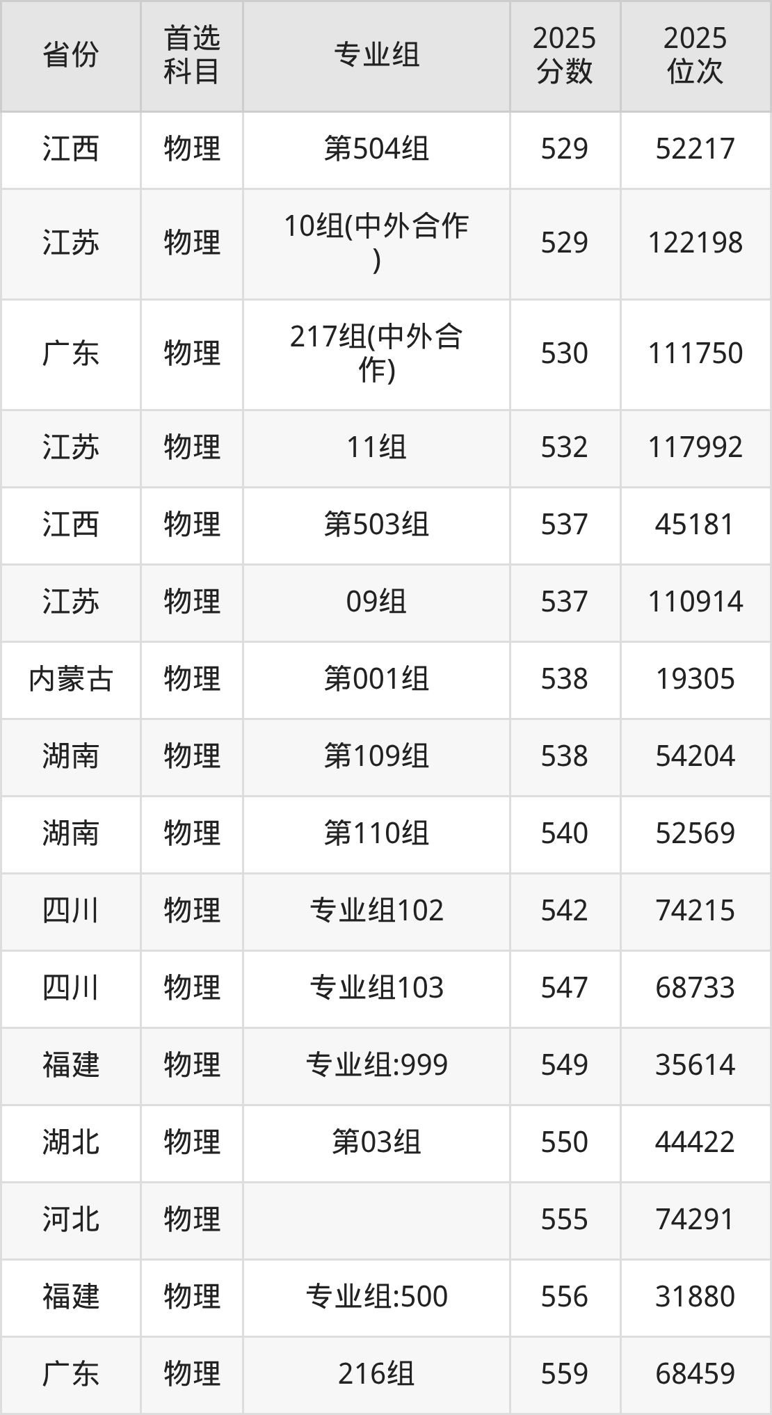 物理类:09组537分、110914名,10组(中外合作)529分、122198名,11组532分、117992名,12组(中外合作)522分、132082名,13组565分、73284名,14组566分、72122名;