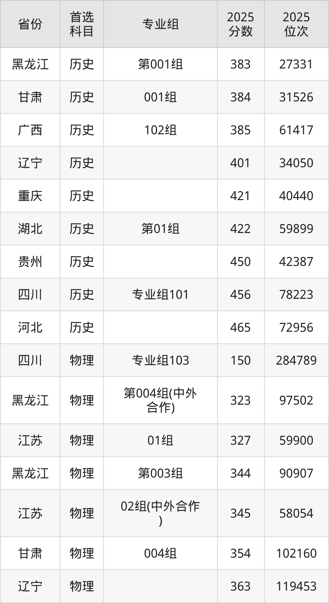 历史类最低分对应地区为黑龙江(第001组),录取位次为27331,超专科线223分;最高分对应地区为河北,录取位次为72956,超专科线265分。