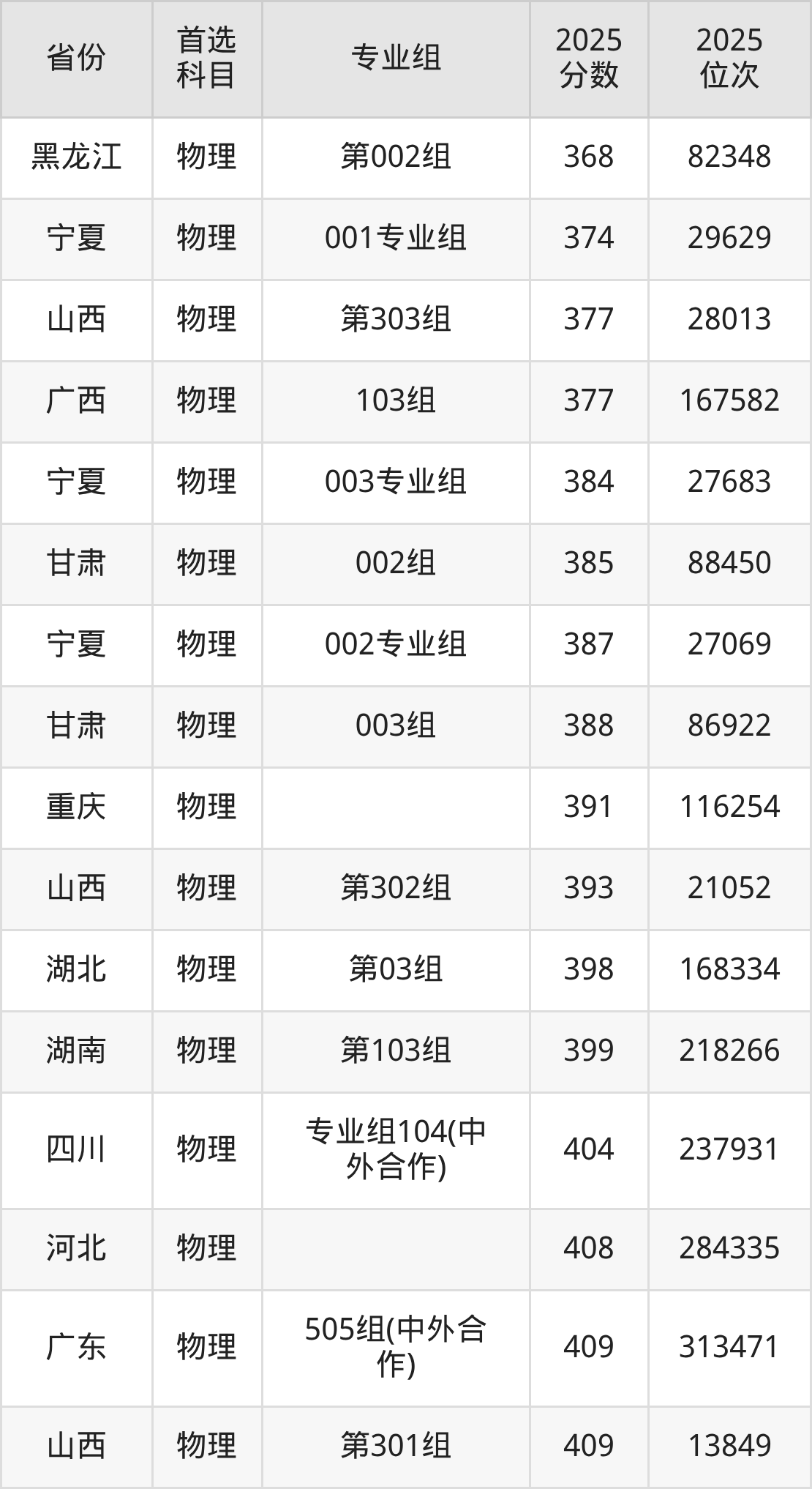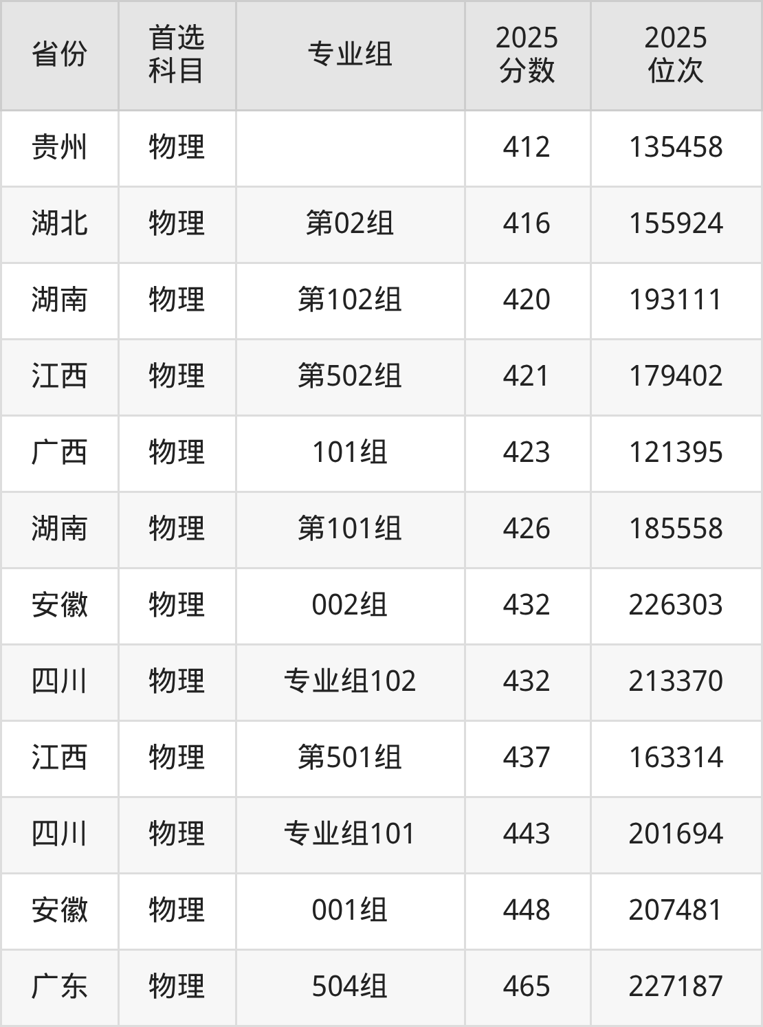 物理类最低分对应地区为四川(专业组103),录取位次为284789;最高分对应地区为广东(504组),录取位次为227187,超专科线265分。