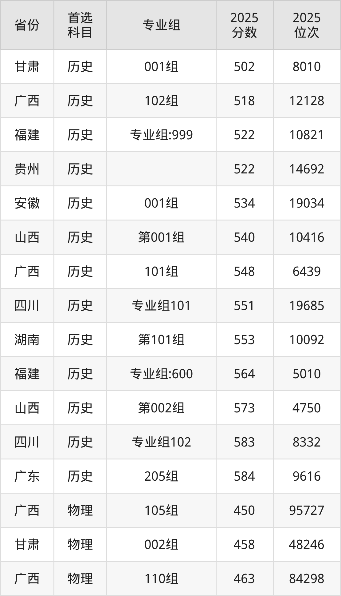 历史类最低分对应地区为甘肃(001组),录取位次为8010;最高分对应地区为广东(205组),录取位次为9616。