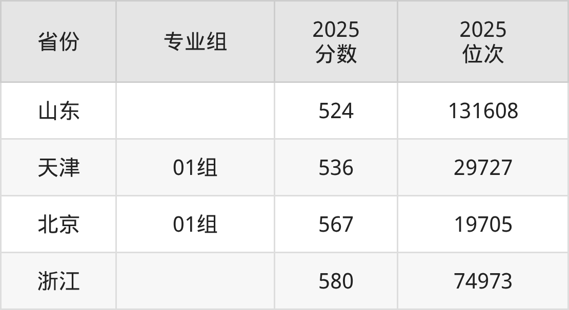 最低分对应地区为山东,录取位次为131608,超一段线83分;最高分对应地区为浙江,录取位次为74973,超一段线91分。
