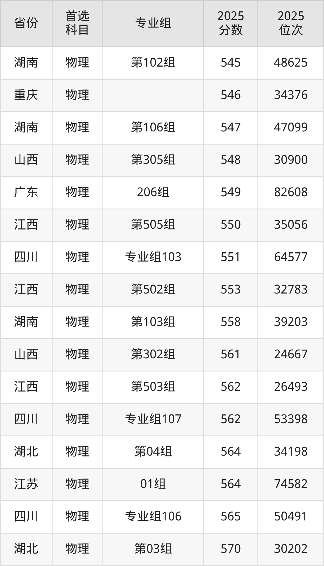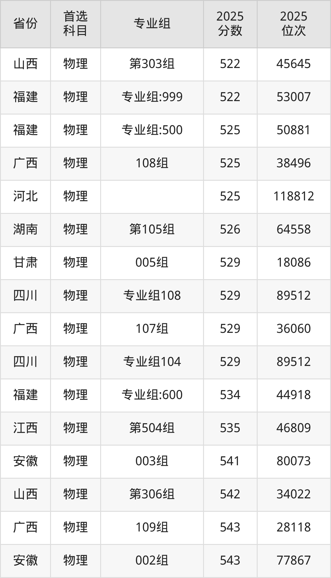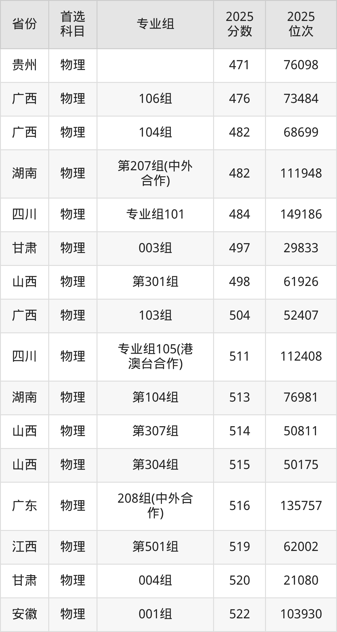物理类最低分对应地区为广西(105组),录取位次为95727;最高分对应地区为湖北(第02组),录取位次为15562,超本科线171分。