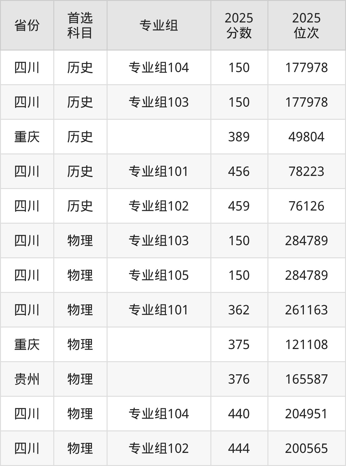 历史类最低分对应地区为四川(专业组104),录取位次为177978;最高分对应地区为四川(专业组102),录取位次为76126,超专科线309分。