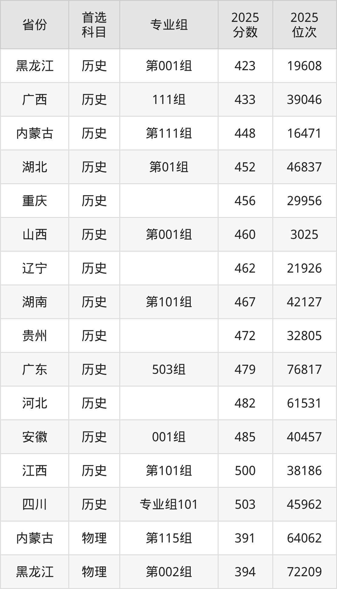 历史类最低分对应地区为黑龙江(第001组),录取位次为19608,超专科线263分;最高分对应地区为四川(专业组101),录取位次为45962,超专科线353分。