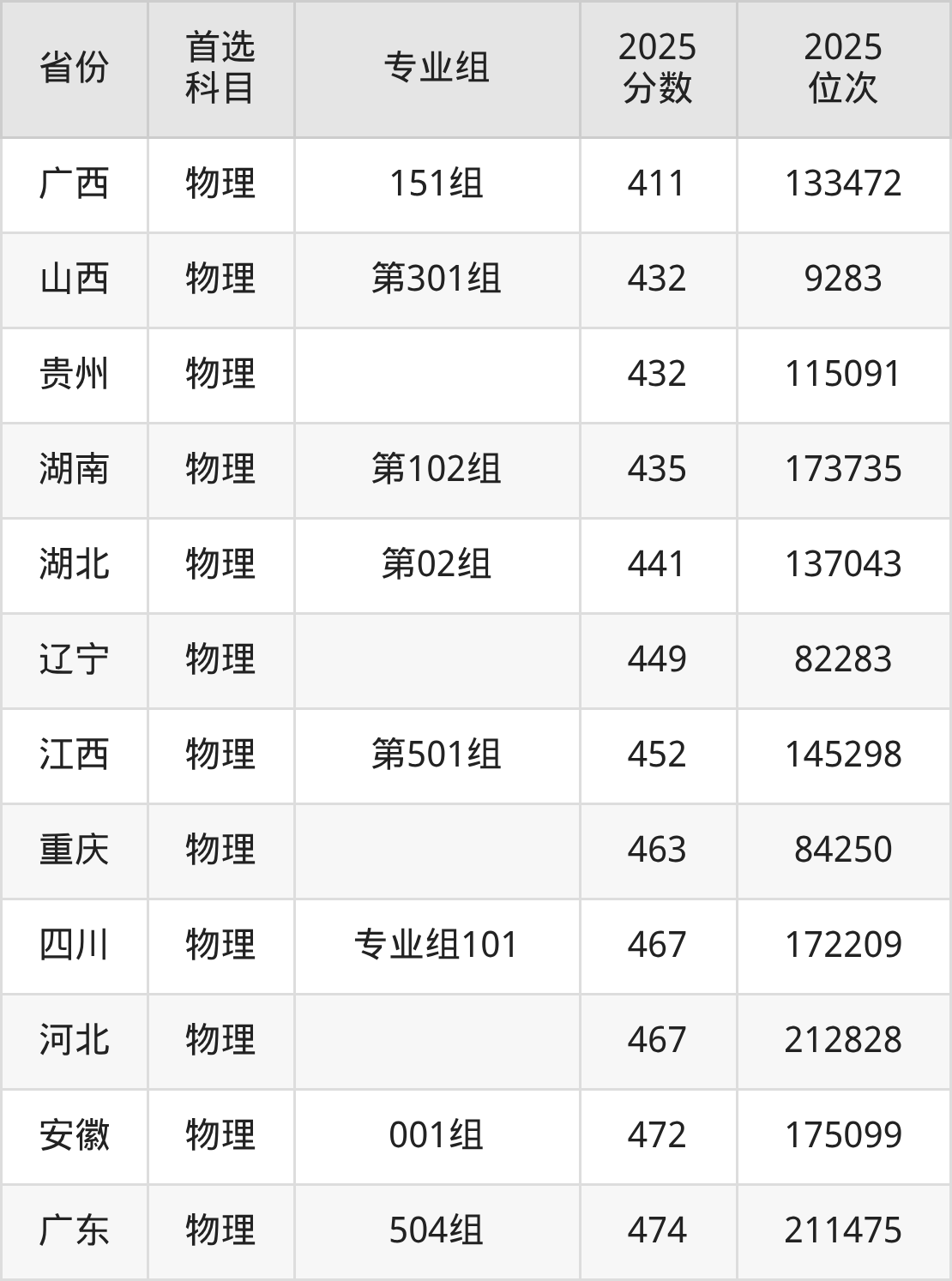 物理类最低分对应地区为内蒙古(第115组),录取位次为64062,超专科线231分;最高分对应地区为广东(504组),录取位次为211475,超专科线274分。