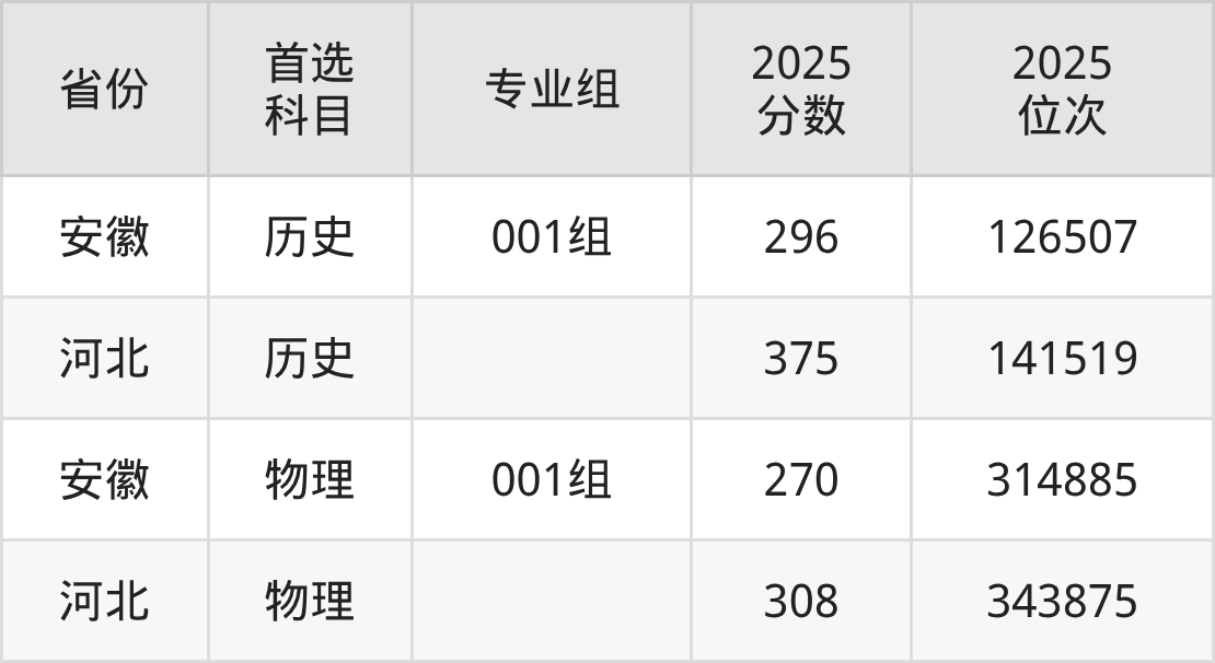 历史类最低分对应地区为安徽(001组),录取位次为126507,超专科线96分;最高分对应地区为河北,录取位次为141519,超专科线175分。