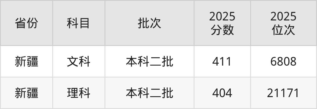 文科最低分对应地区为新疆,录取位次为6808,超二本线81分。
