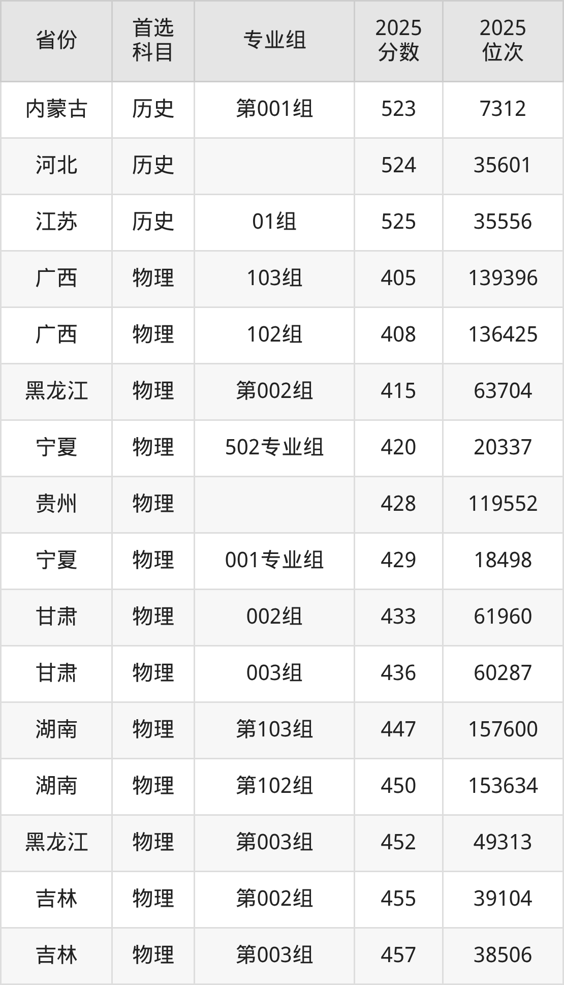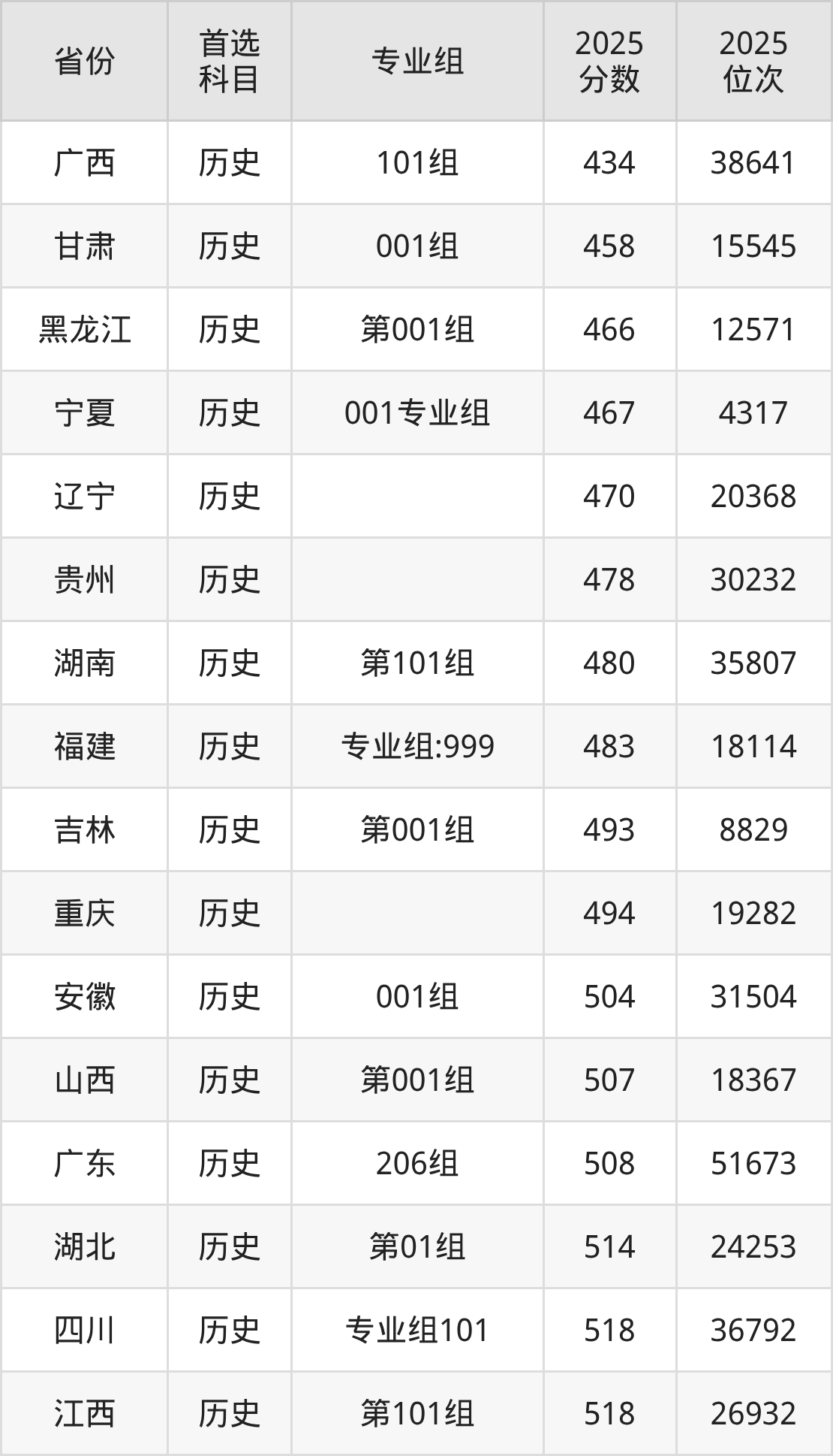 历史类最低分对应地区为广西(101组),录取位次为38641,超本科线32分;最高分对应地区为江苏(01组),录取位次为35556,超本科线43分。