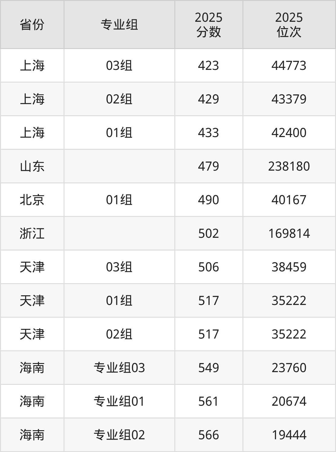 最低分对应地区为上海(03组),录取位次为44773,超本科线21分;最高分对应地区为海南(专业组02),录取位次为19444,超本科线86分。