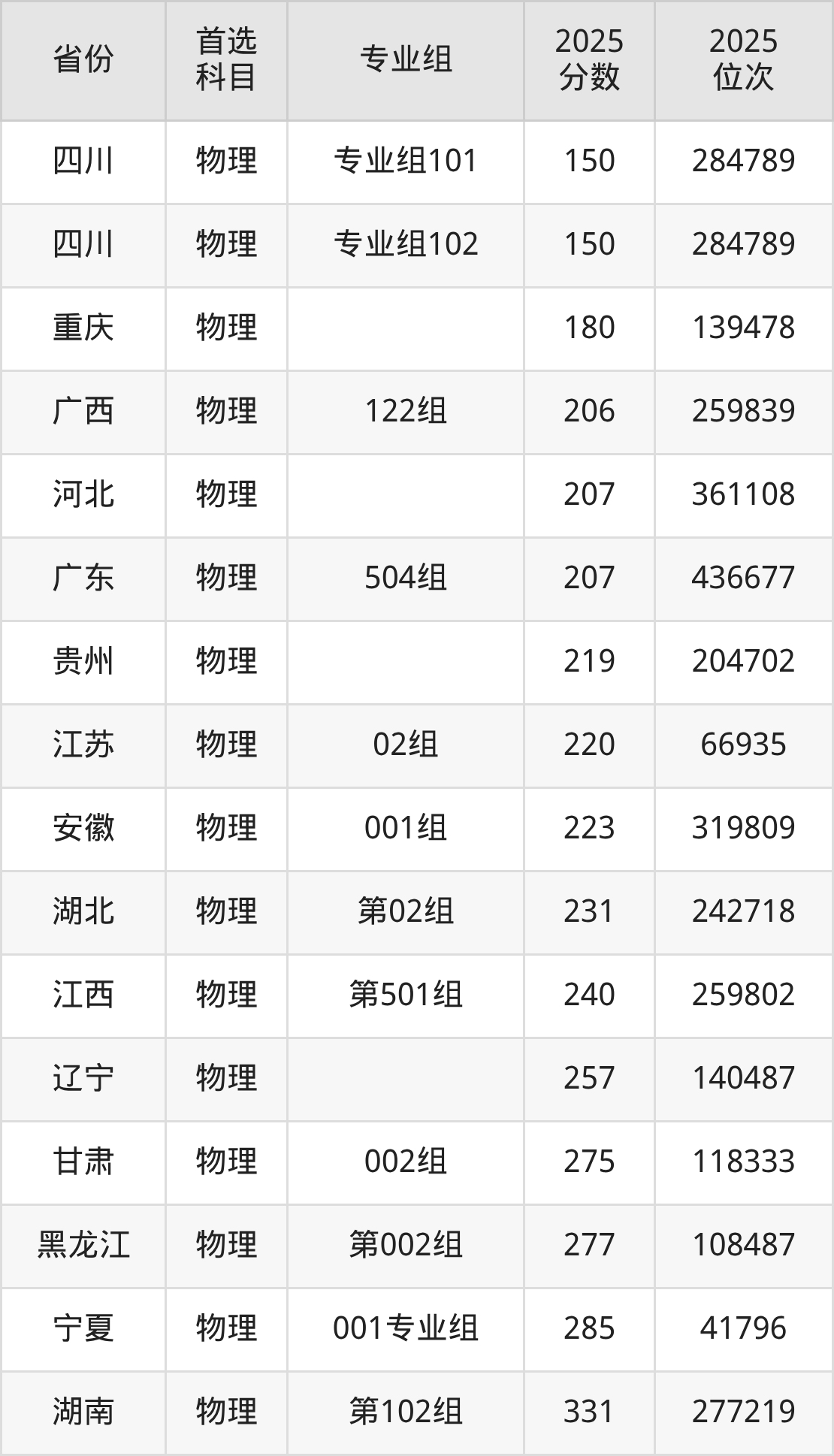 物理类最低分对应地区为四川(专业组103),录取位次为284789;最高分对应地区为湖南(第102组),录取位次为277219,超专科线131分。