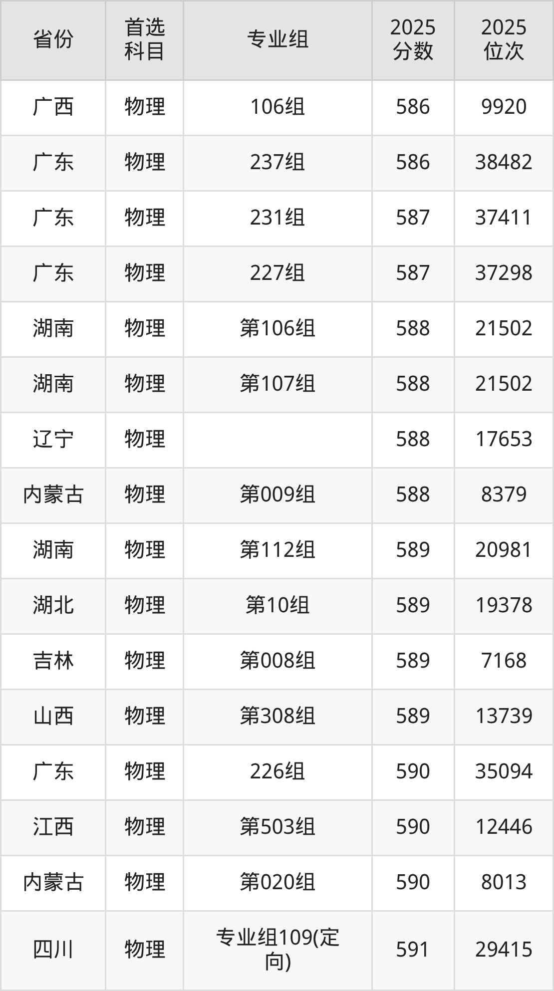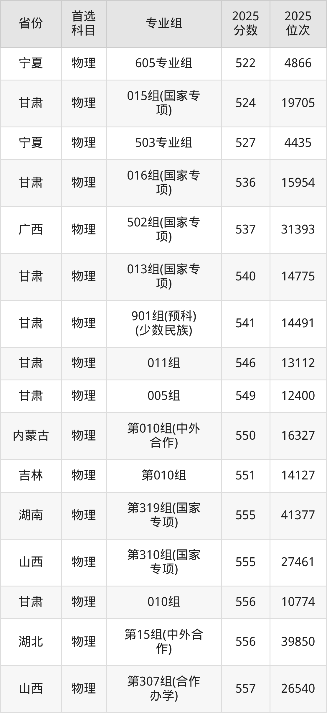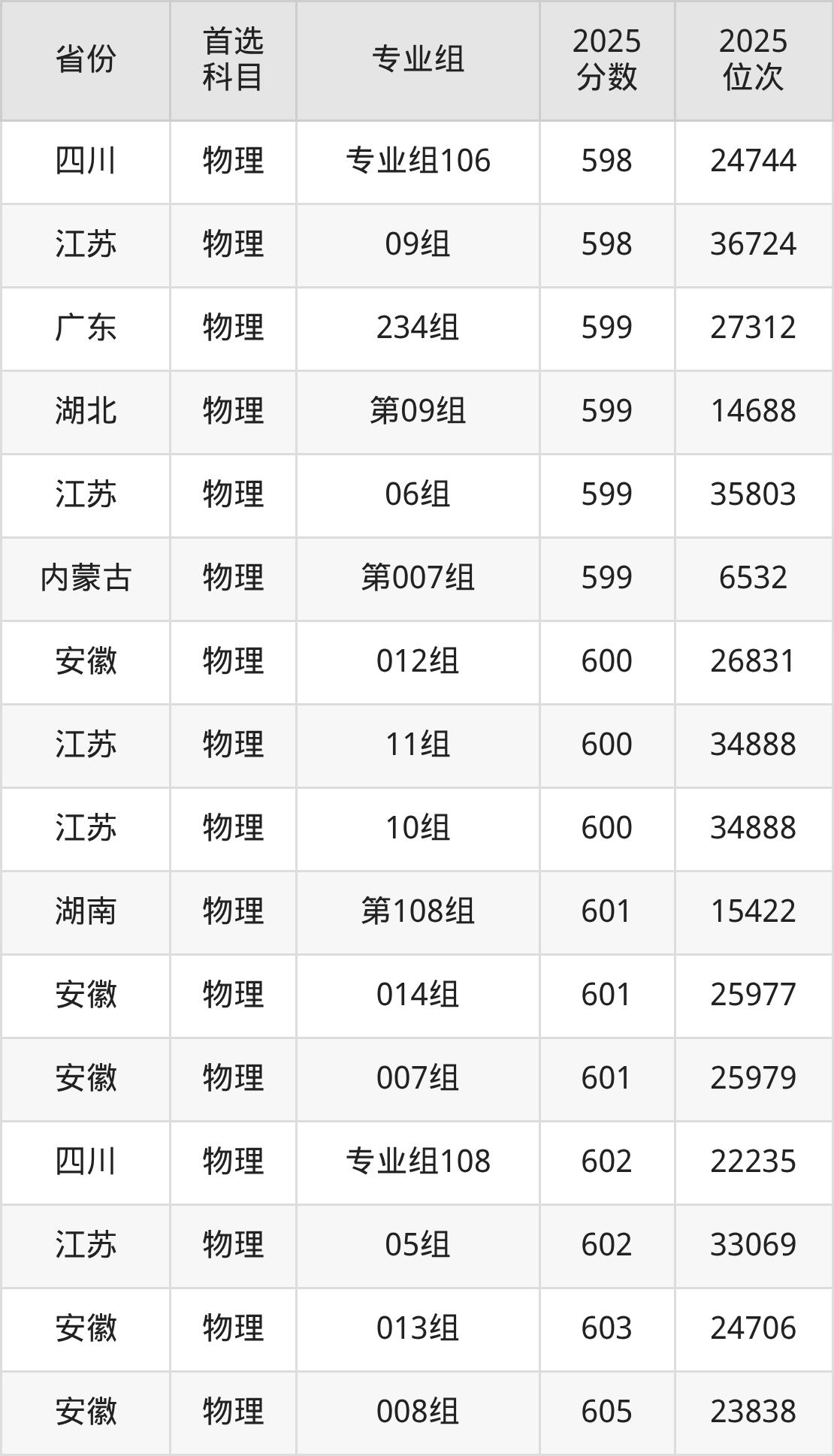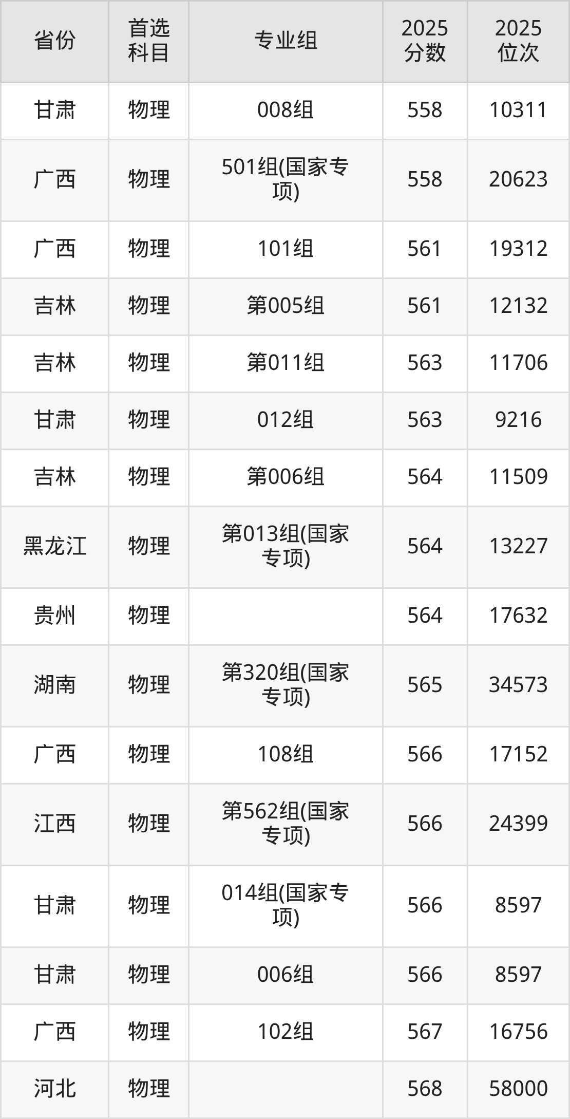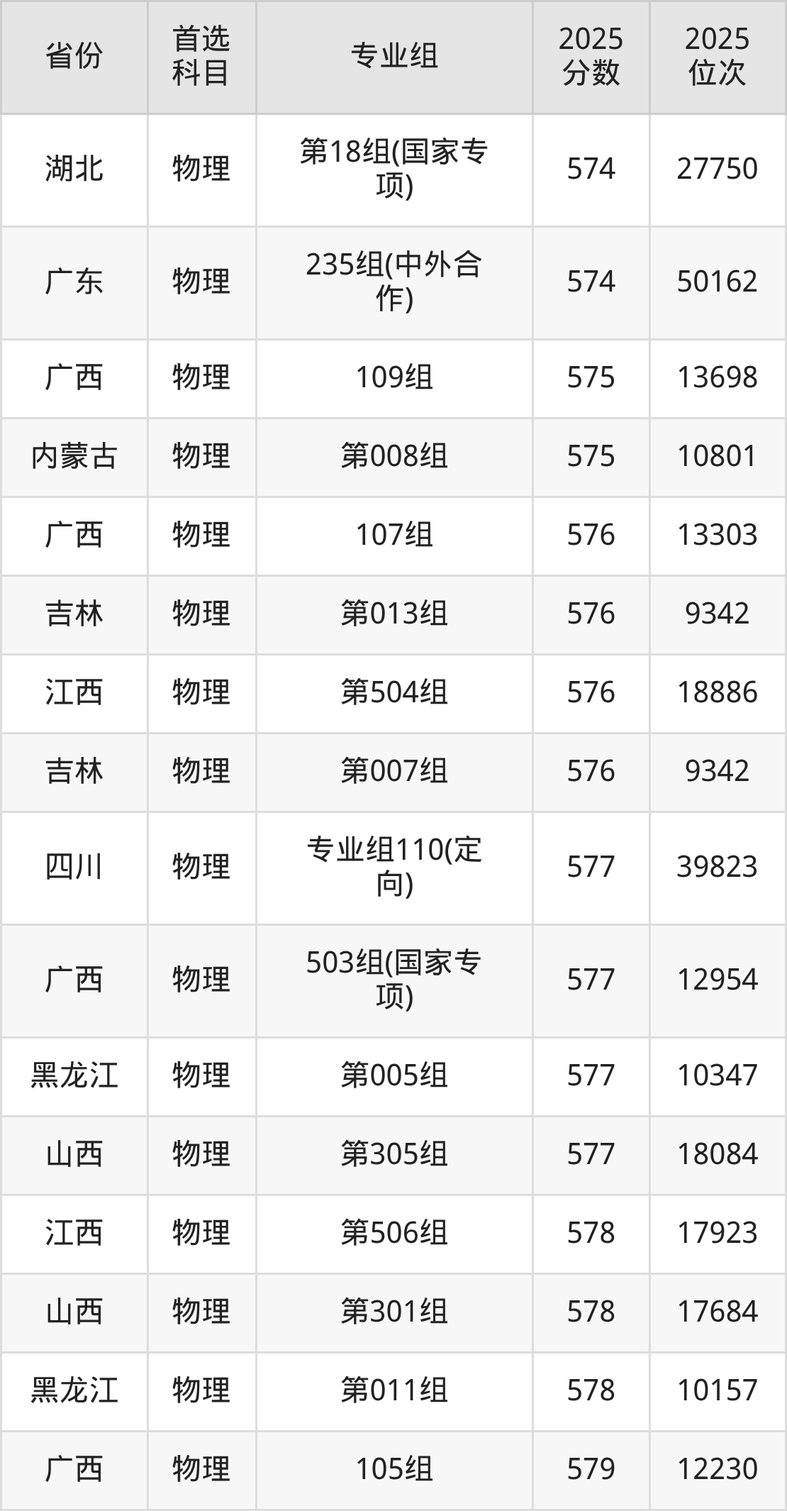 物理类最低分对应地区为甘肃(009组),录取位次为32386,超本科线117分;最高分对应地区为安徽(010组),录取位次为14763。