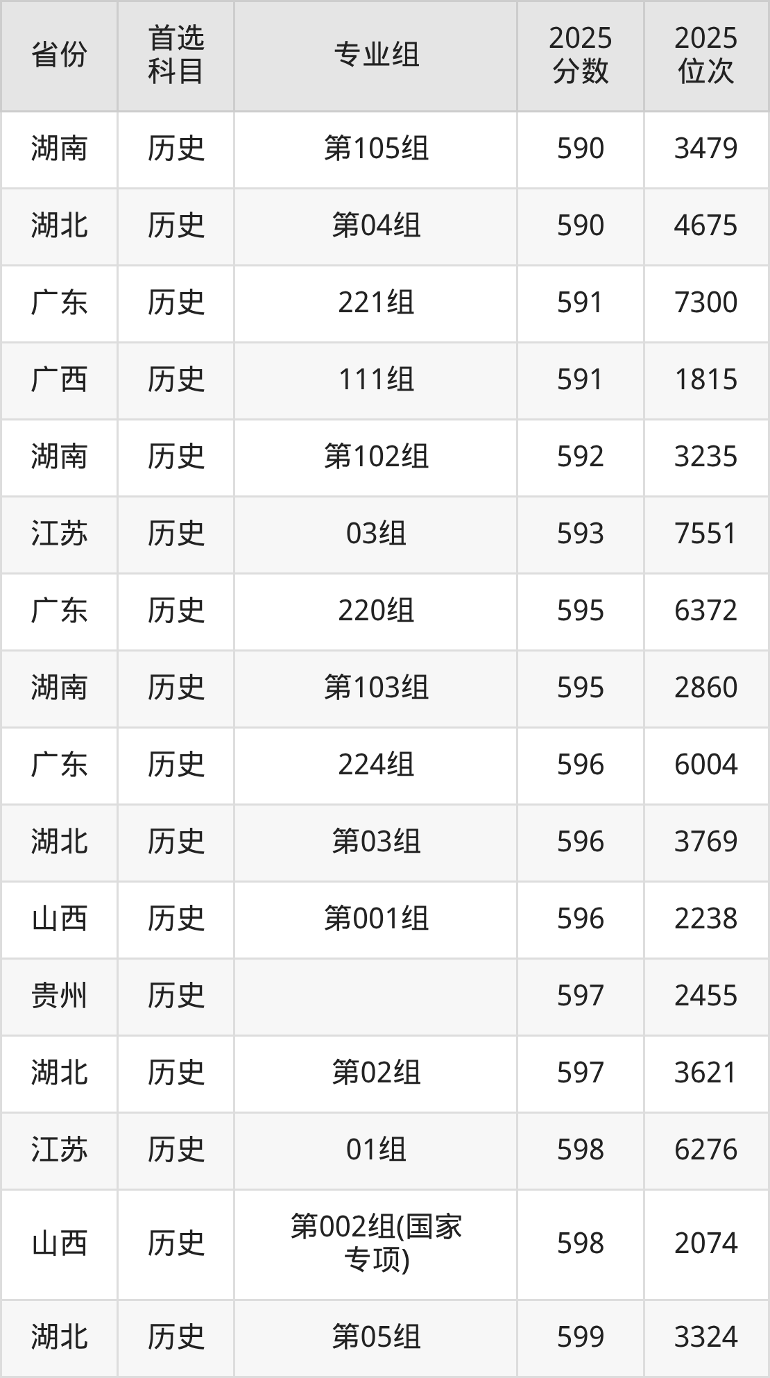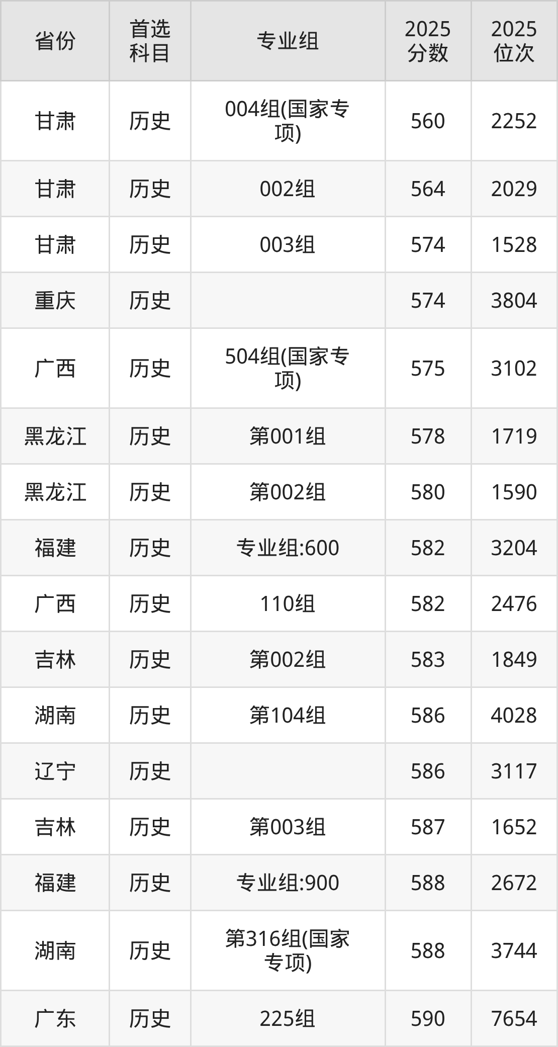 历史类最低分对应地区为甘肃(004组(国家专项)),录取位次为2252,超本科线148分;最高分对应地区为河北,录取位次为3521,超本科线136分。