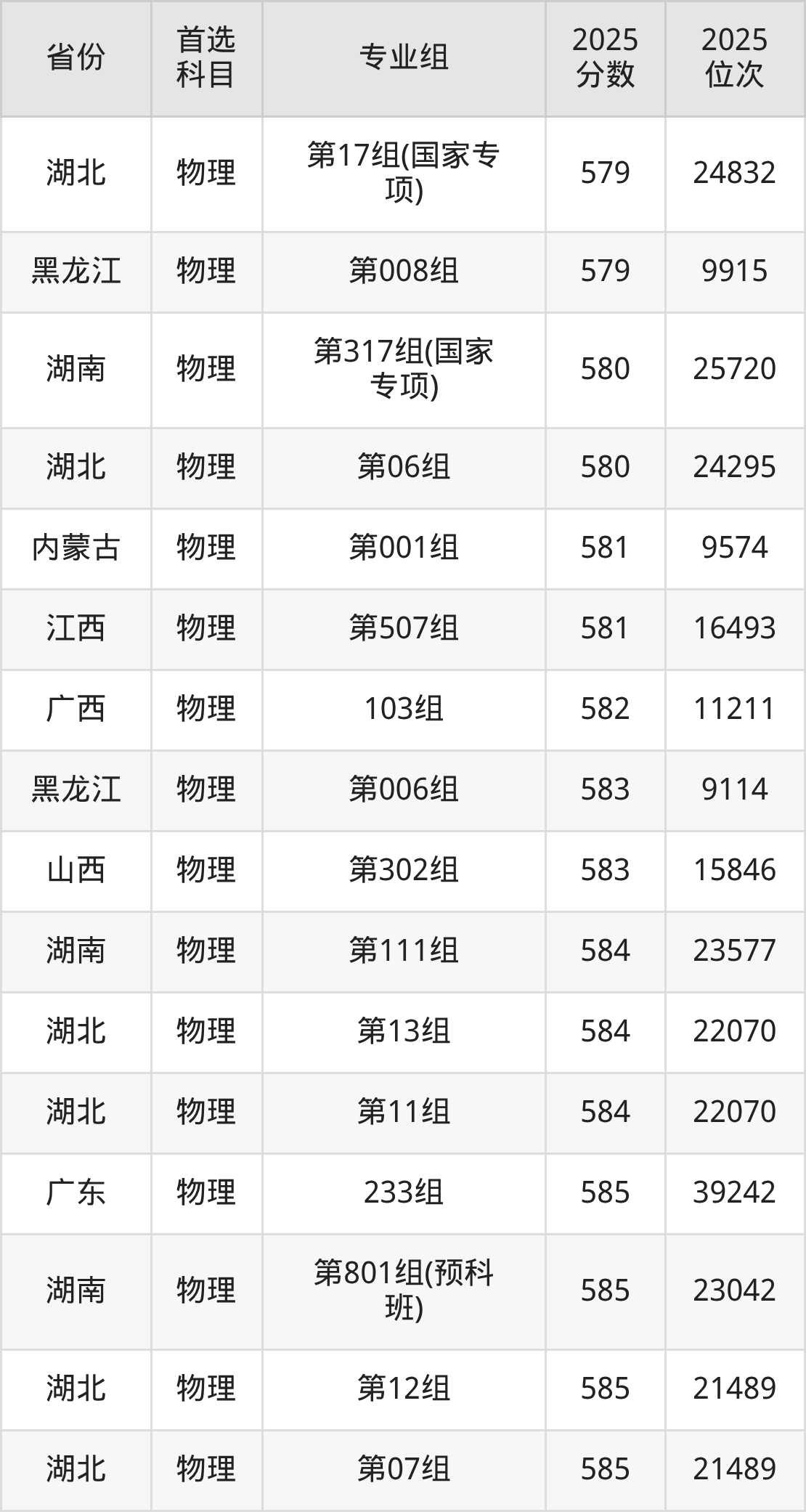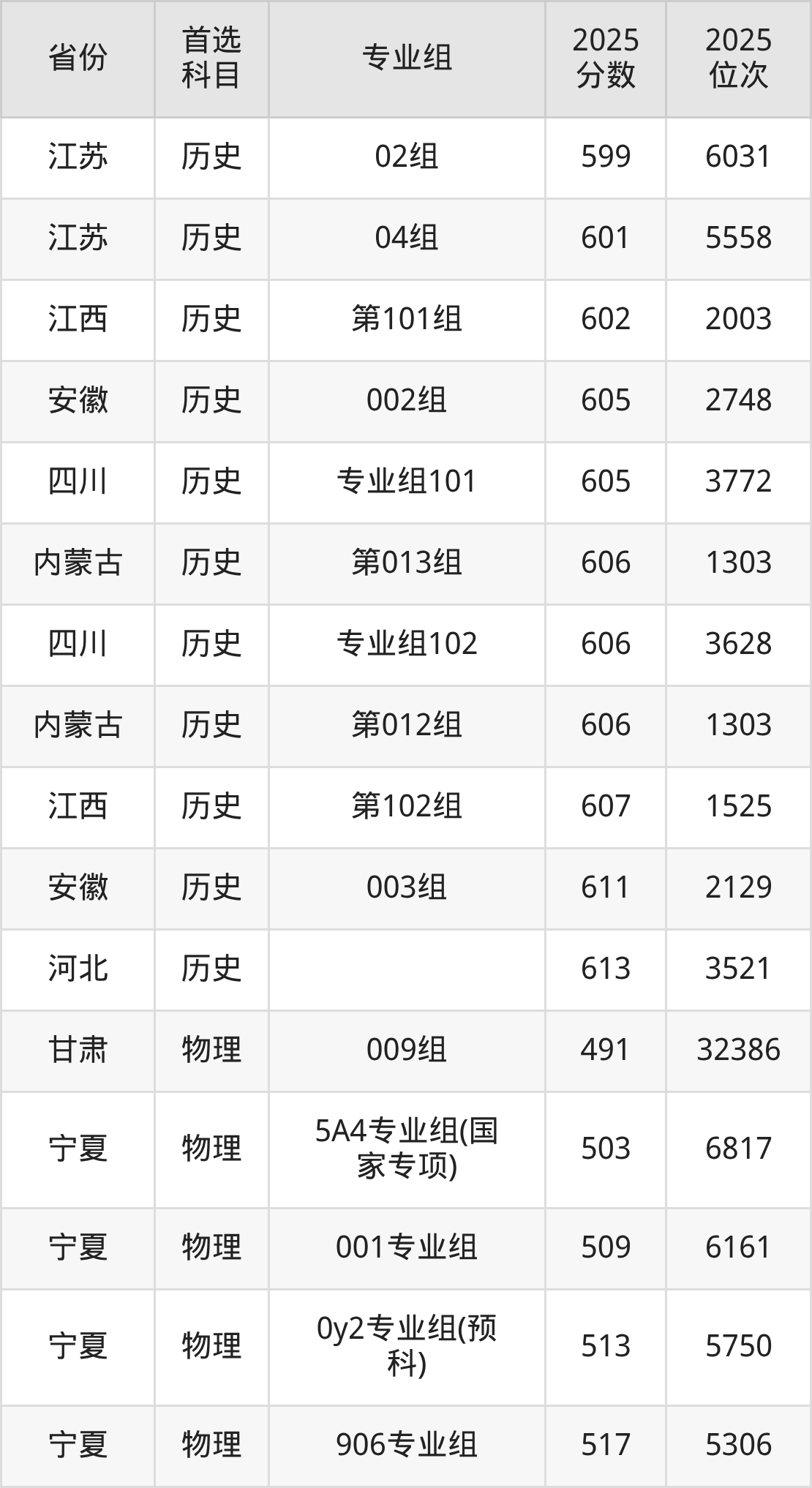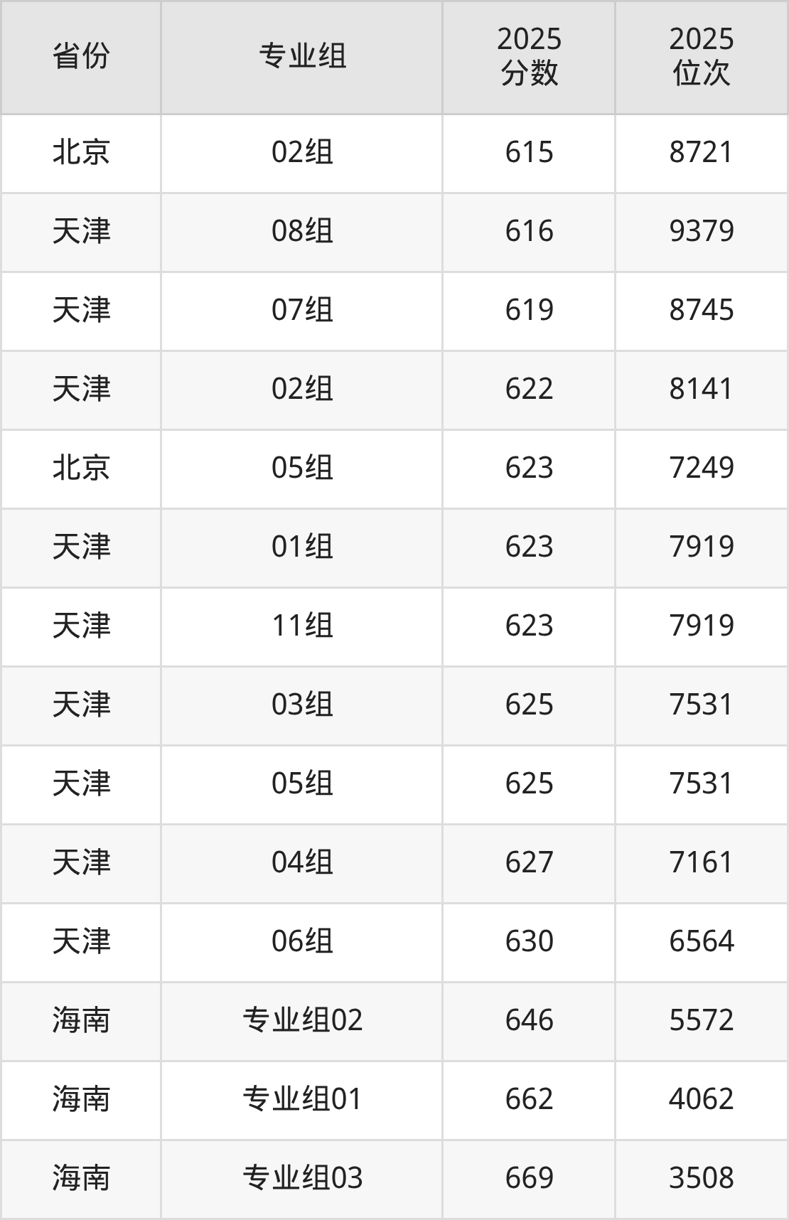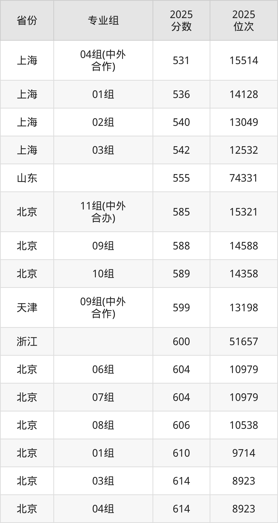 01组610分、9714名,02组615分、8721名,03组614分、8923名,04组614分、8923名,05组623分、7249名,06组604分、10979名,07组604分、10979名,08组606分、10538名,09组588分、14588名,10组589分、14358名,11组(中外合办)585分、15321名;