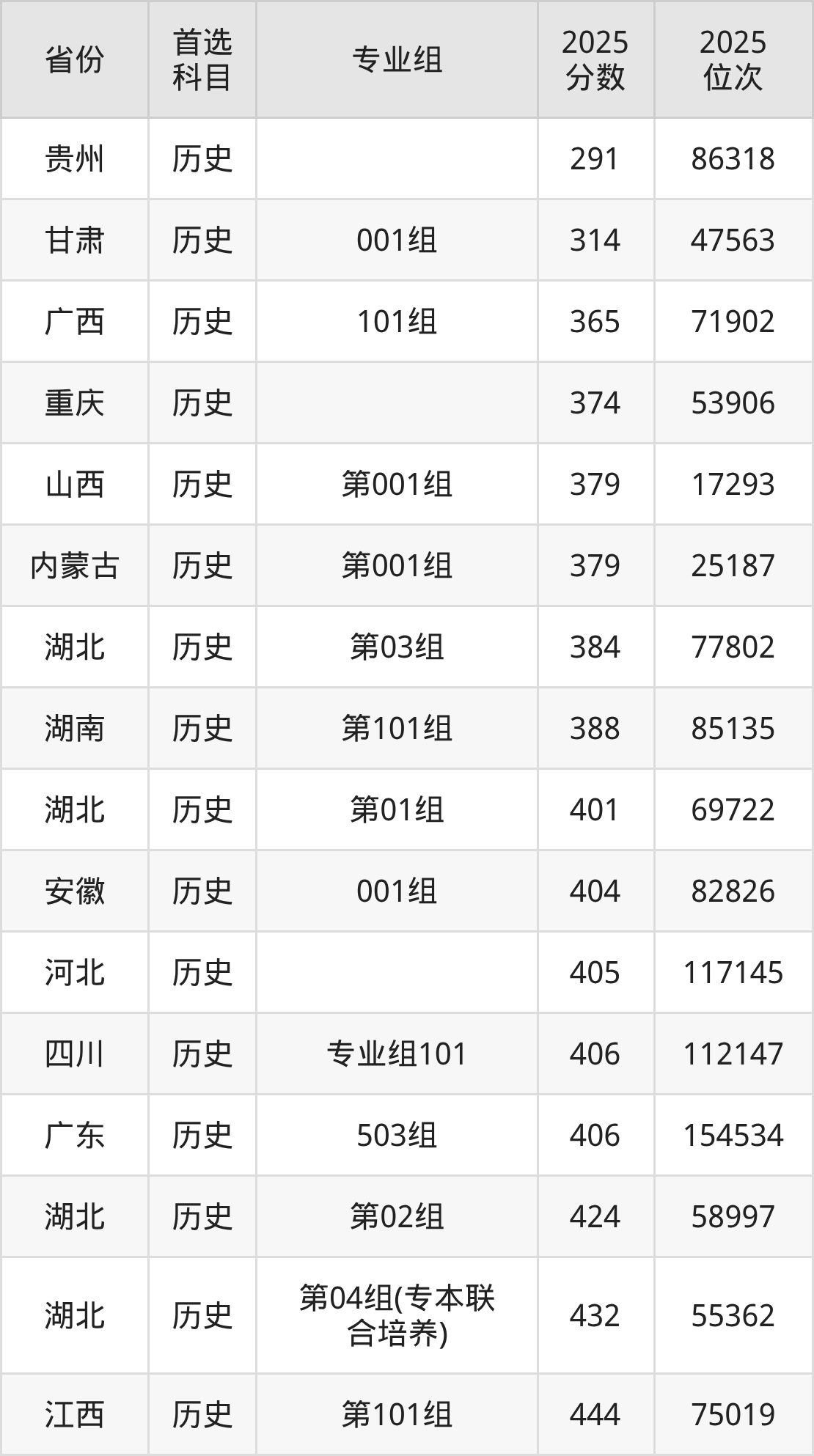 历史类最低分对应地区为贵州,录取位次为86318,超专科线111分;最高分对应地区为湖北(第05组(专本联合培养)),录取位次为49326,超专科线246分。