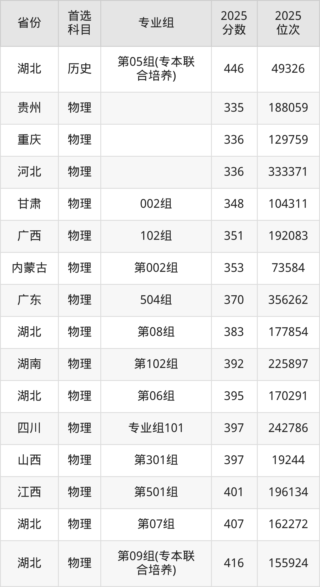物理类最低分对应地区为贵州,录取位次为188059,超专科线155分;最高分对应地区为湖北(第10组(专本联合培养)),录取位次为147880,超专科线227分。