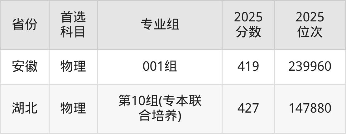 物理类:第06组395分、170291名,第07组407分、162272名,第08组383分、177854名,第09组(专本联合培养)416分、155924名,第10组(专本联合培养)427分、147880名;