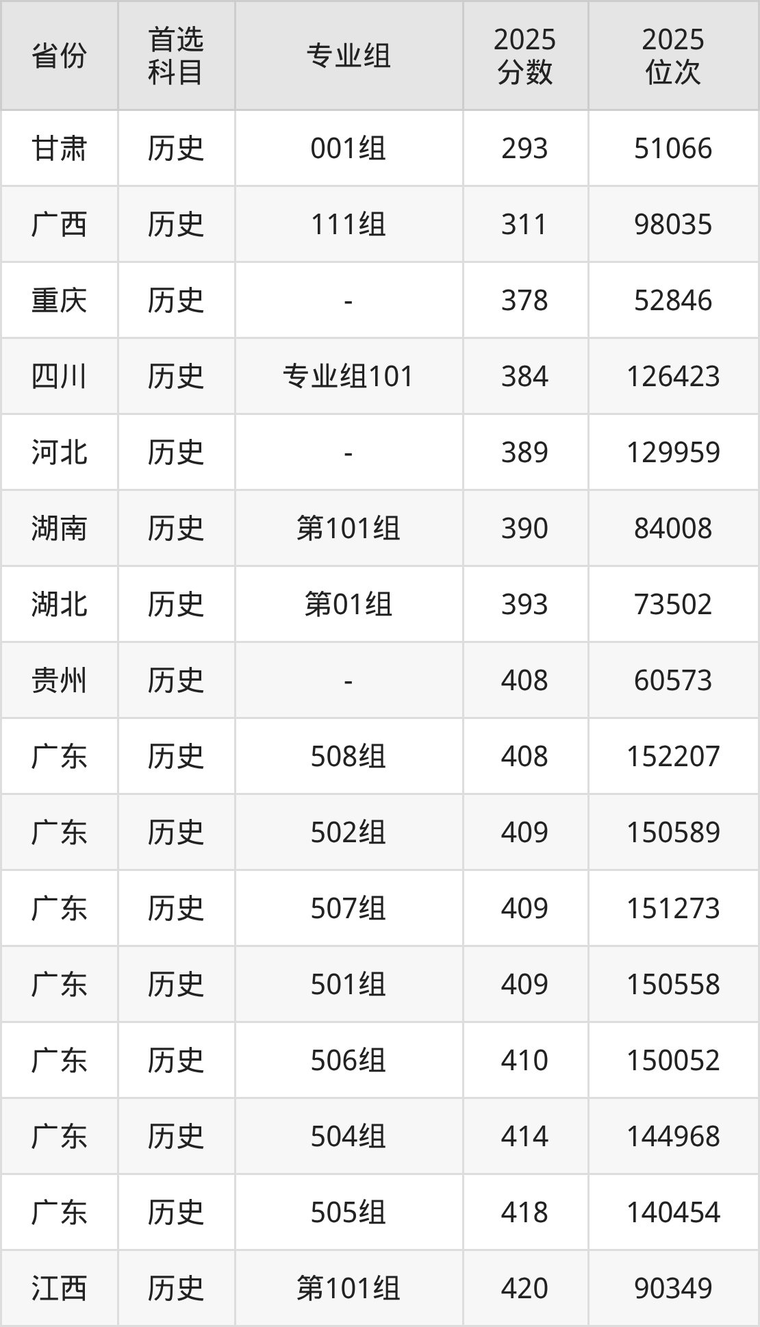 历史类:501组409分、150558名,502组409分、150589名,503组420分、138630名,504组414分、144968名,505组418分、140454名,506组410分、150052名,507组409分、151273名,508组408分、152207名,509组(协同培养)506分、53099名,510组(协同培养)424分、134326名;
