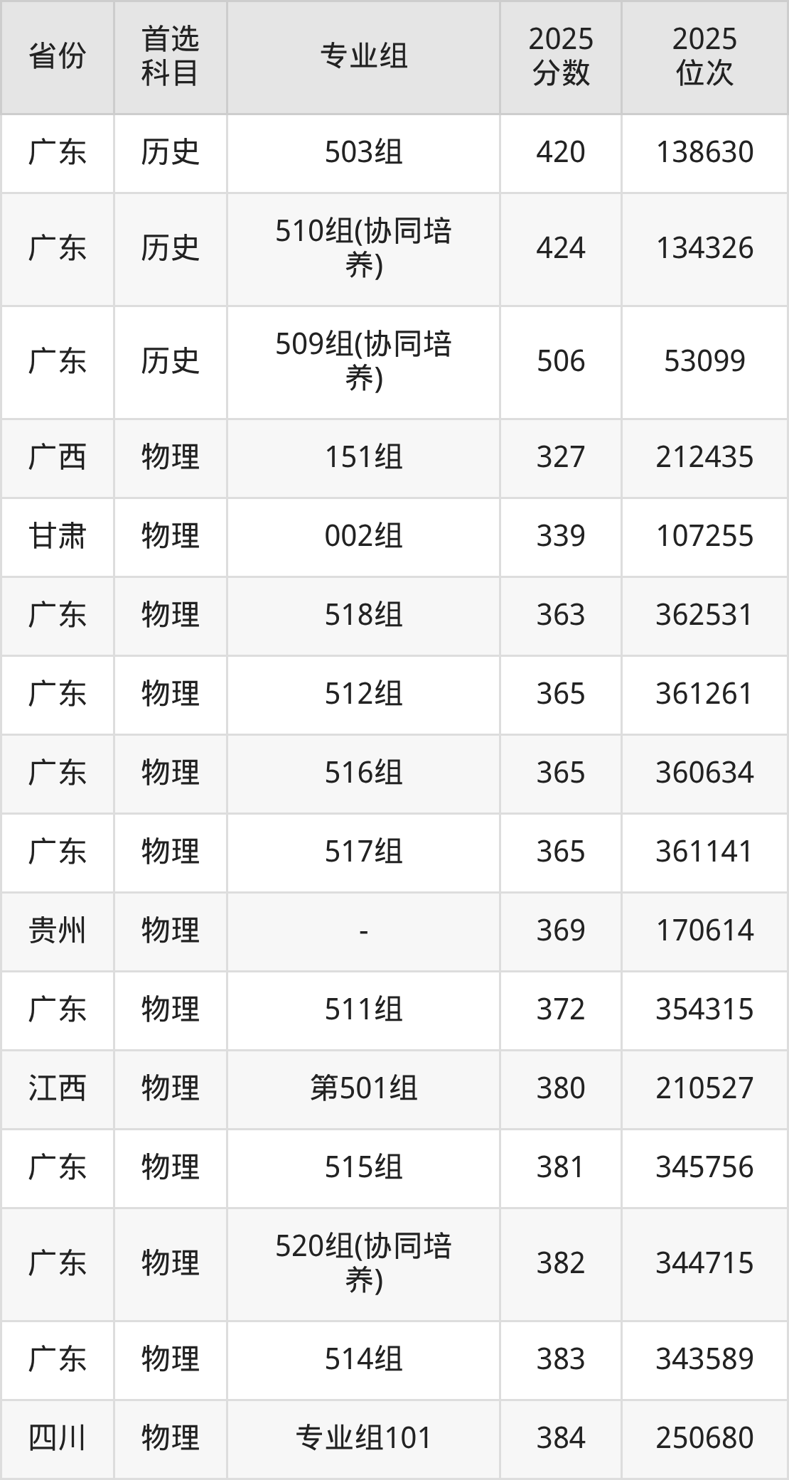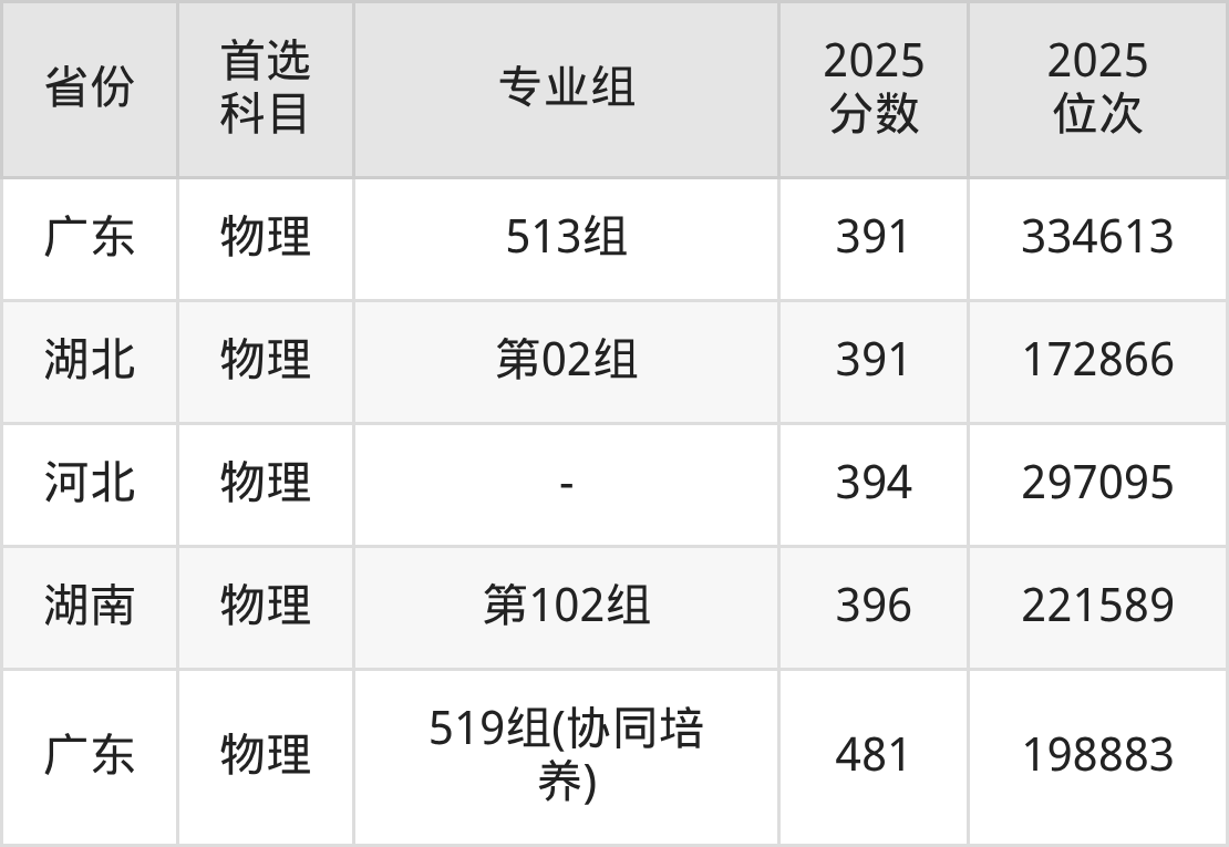 物理类最低分对应地区为广西(151组),录取位次为212435,超专科线127分;最高分对应地区为广东(519组(协同培养)),录取位次为198883,超专科线281分。