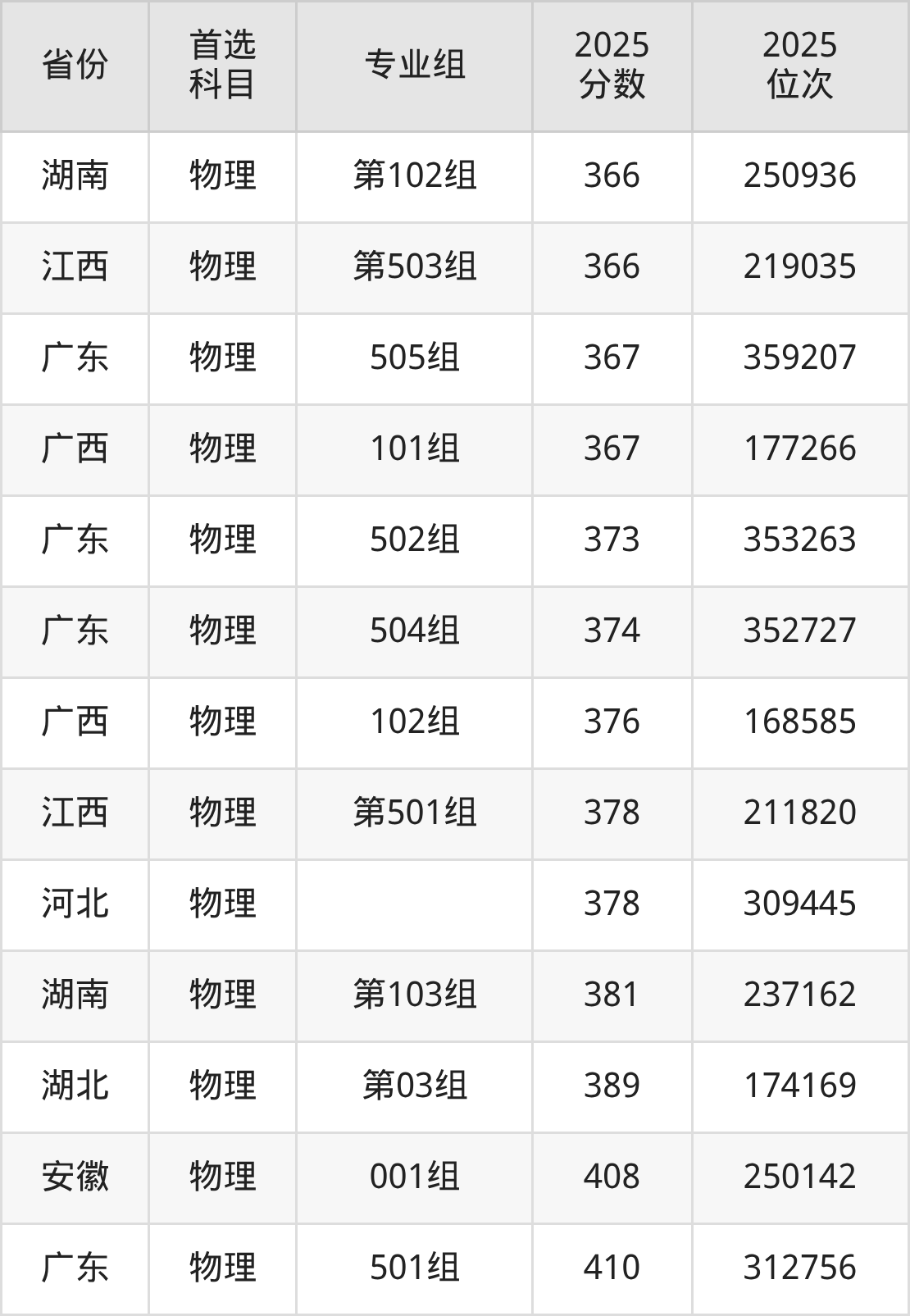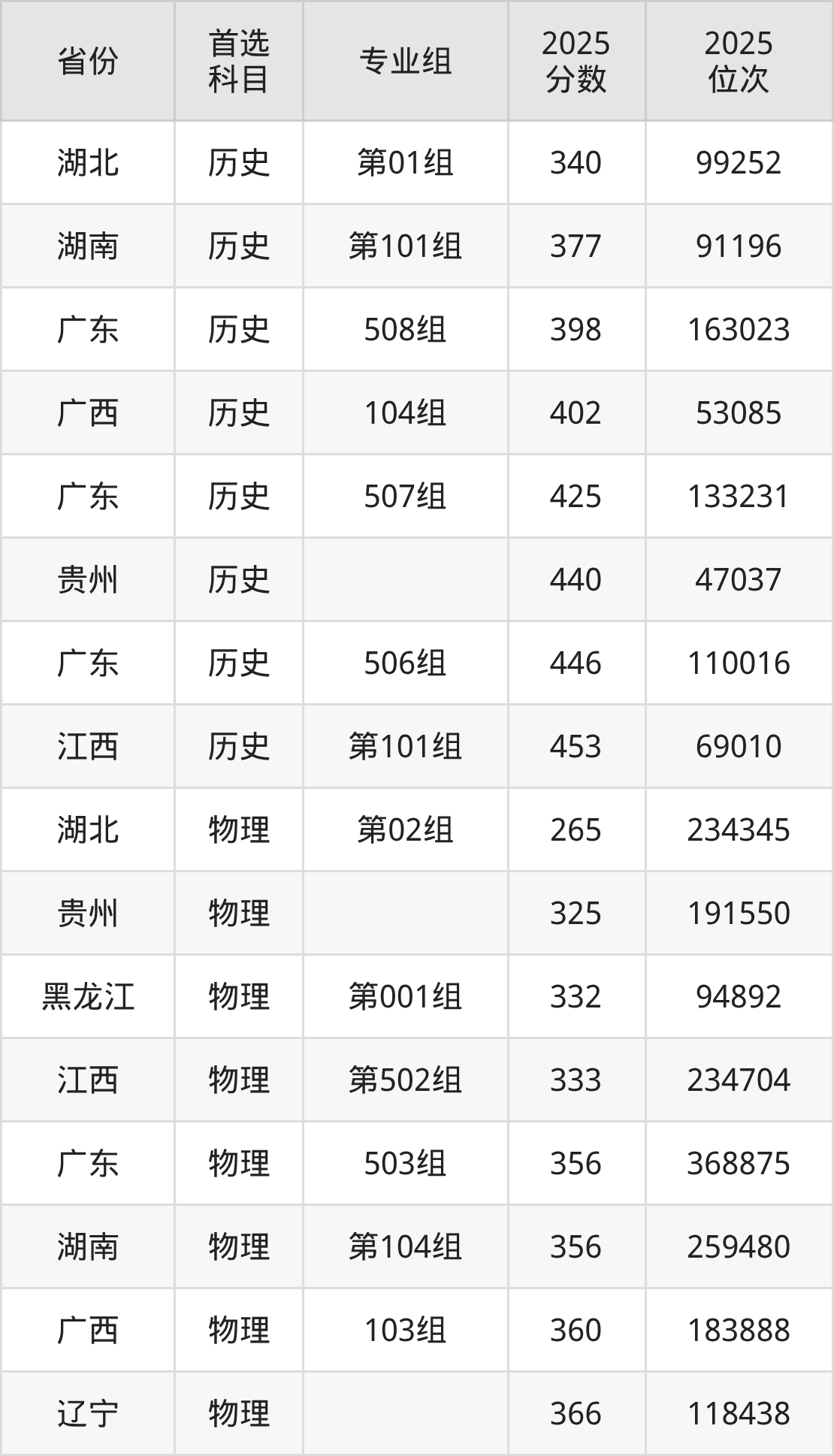 物理类最低分对应地区为湖北(第02组),录取位次为234345,超专科线65分;最高分对应地区为广东(501组),录取位次为312756。