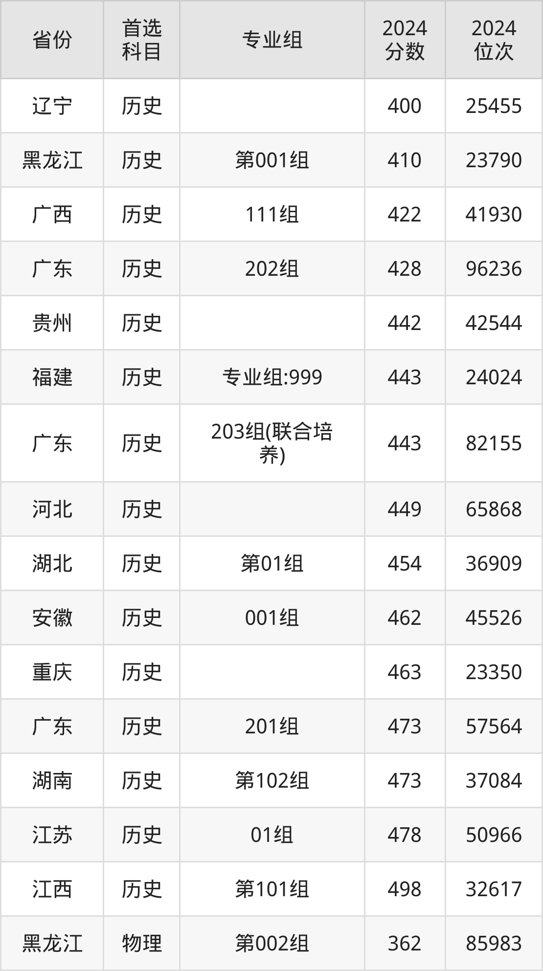 历史类最低分对应地区为辽宁,录取位次为25455,超本科线0分;最高分对应地区为江西(第101组),录取位次为32617,超本科线35分。