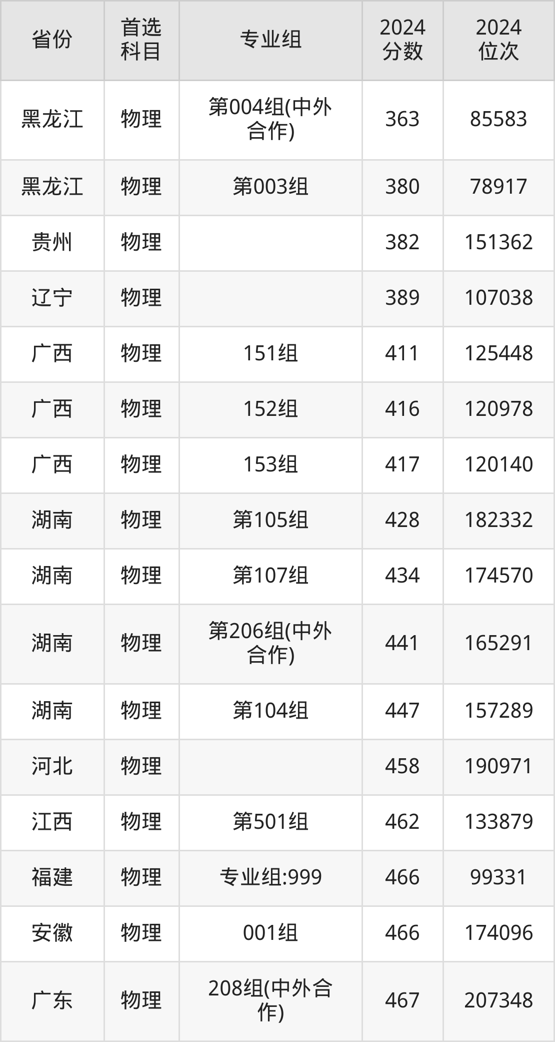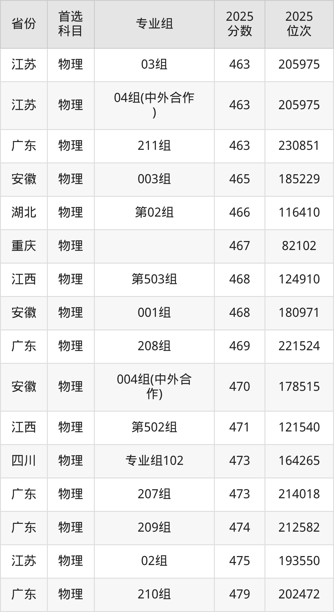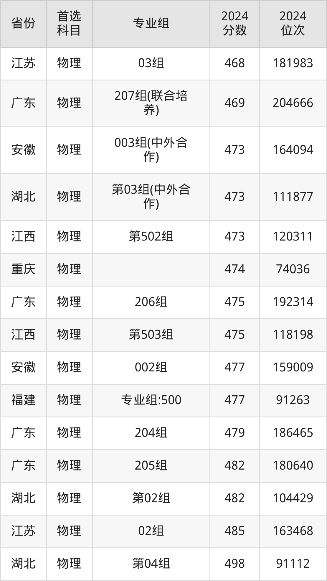 物理类:204组479分、186465名,205组482分、180640名,206组475分、192314名,207组(联合培养)469分、204666名,208组(中外合作)467分、207348名;