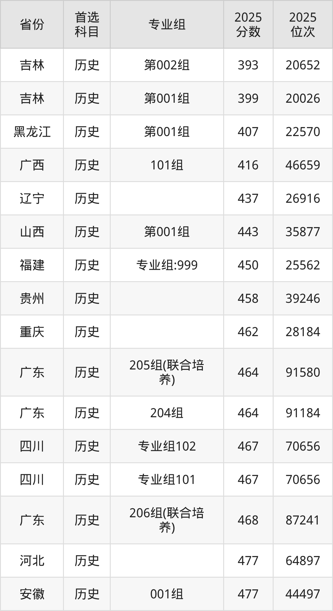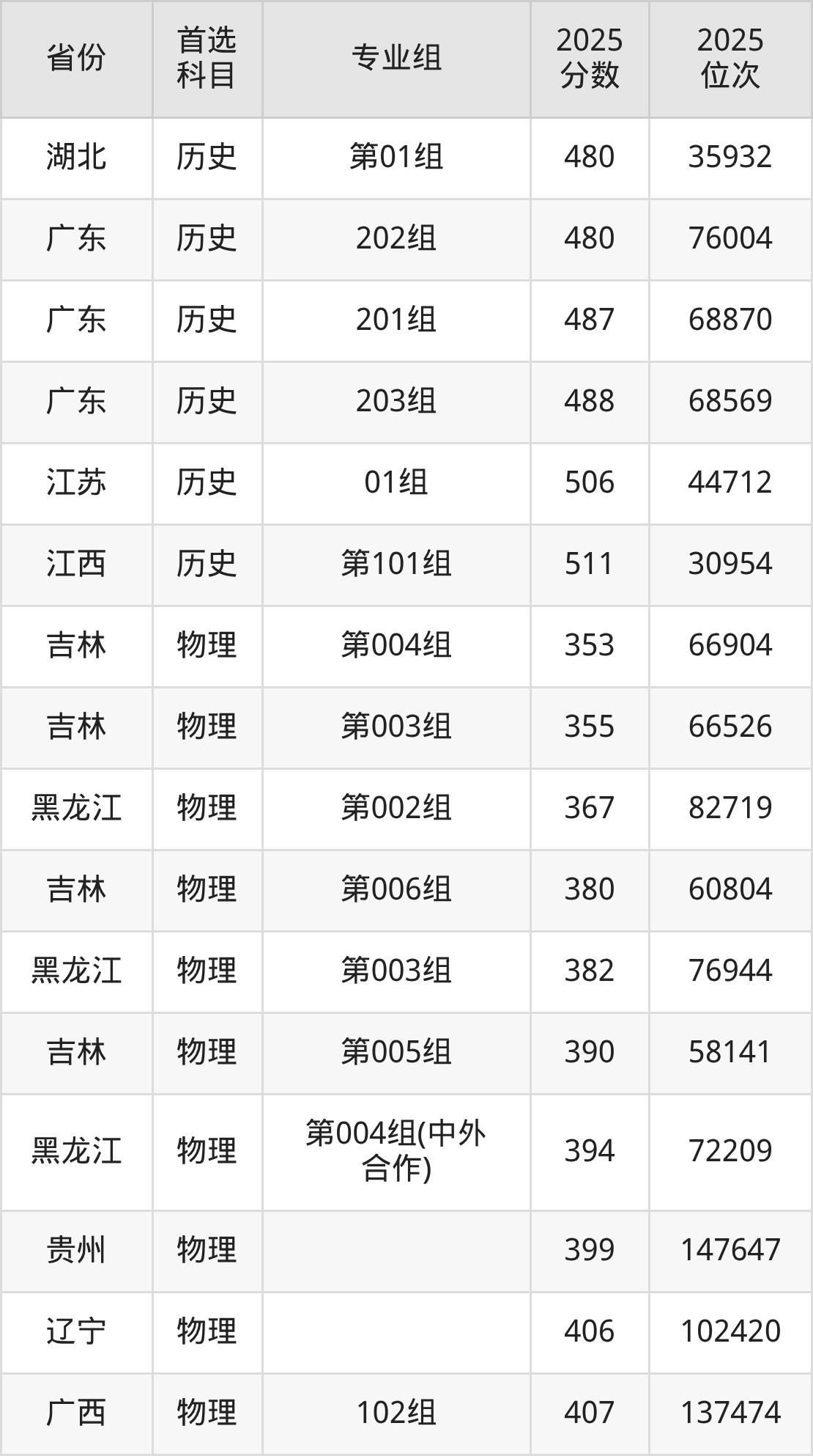 历史类最低分对应地区为吉林(第002组),录取位次为20652,超本科线9分;最高分对应地区为江西(第101组),录取位次为30954,超本科线25分。