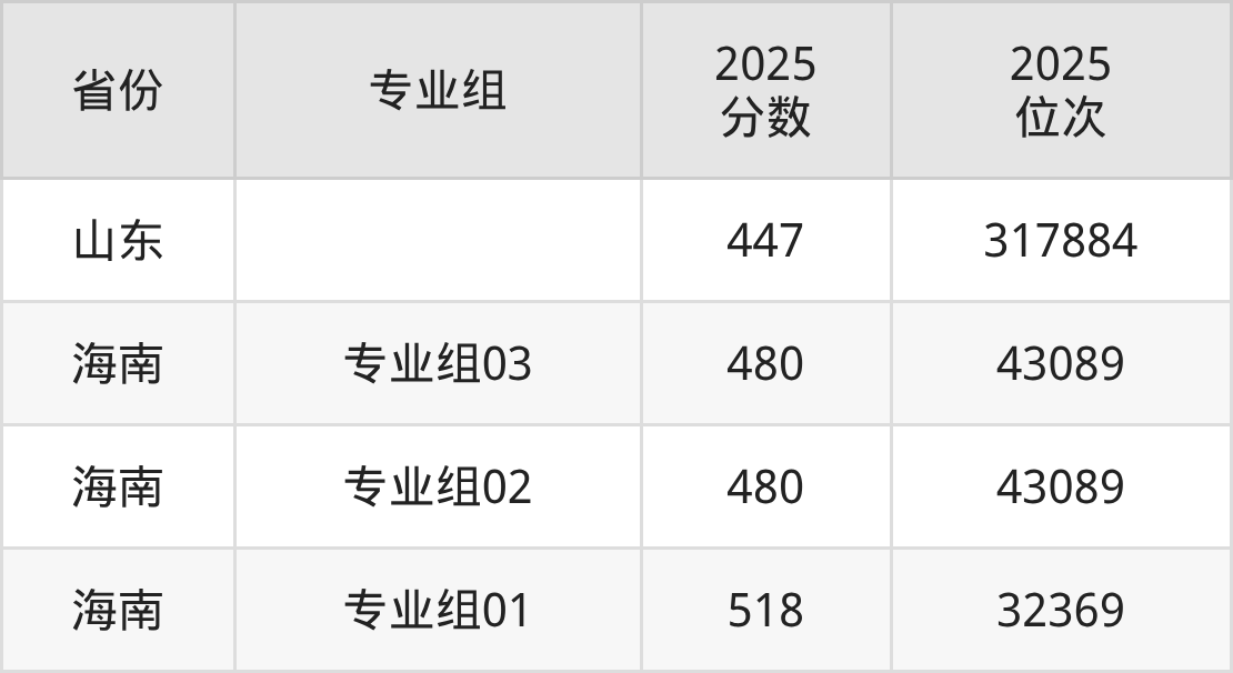 最低分对应地区为山东,录取位次为317884;最高分对应地区为海南(专业组01),录取位次为32369,超本科线38分。