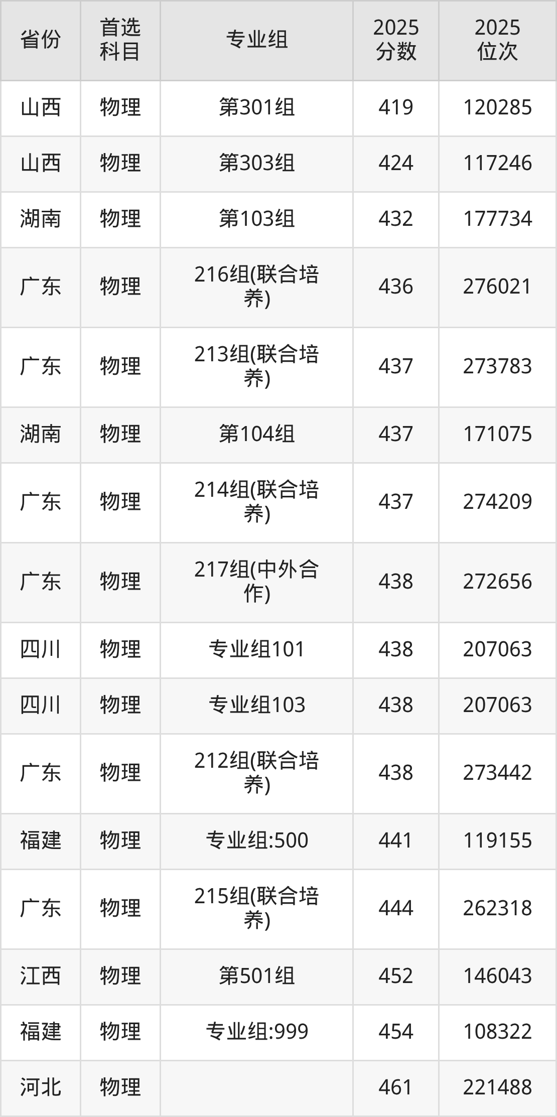 物理类:207组473分、214018名,208组469分、221524名,209组474分、212582名,210组479分、202472名,211组463分、230851名,212组(联合培养)438分、273442名,213组(联合培养)437分、273783名,214组(联合培养)437分、274209名,215组(联合培养)444分、262318名,216组(联合培养)436分、276021名,217组(中外合作)438分、272656名;