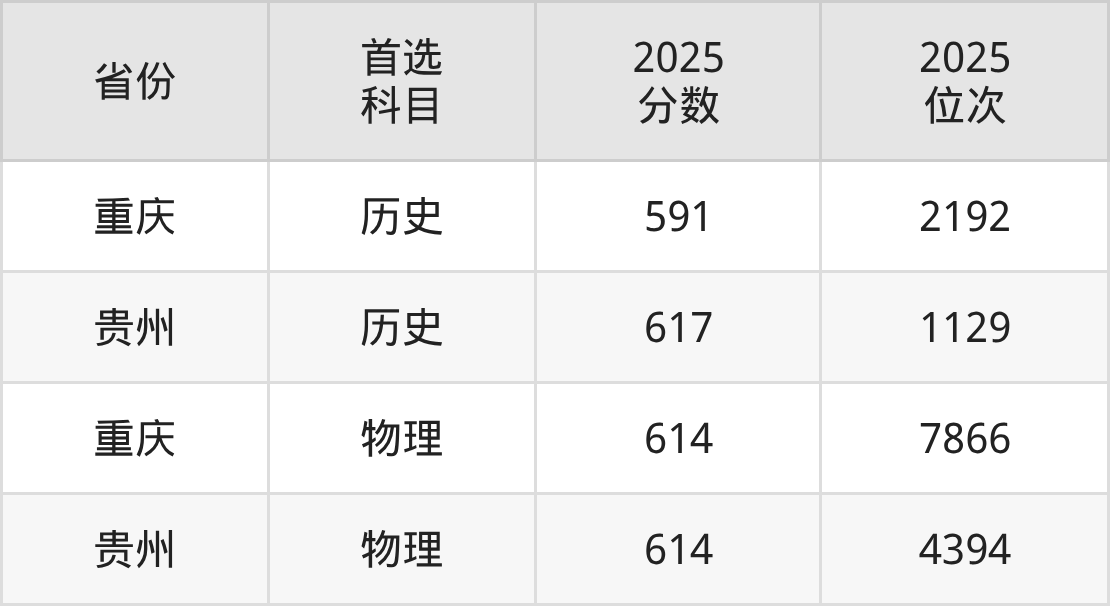 历史类最低分对应地区为重庆,录取位次为2192,超本科线153分;最高分对应地区为贵州,录取位次为1129,超本科线159分。