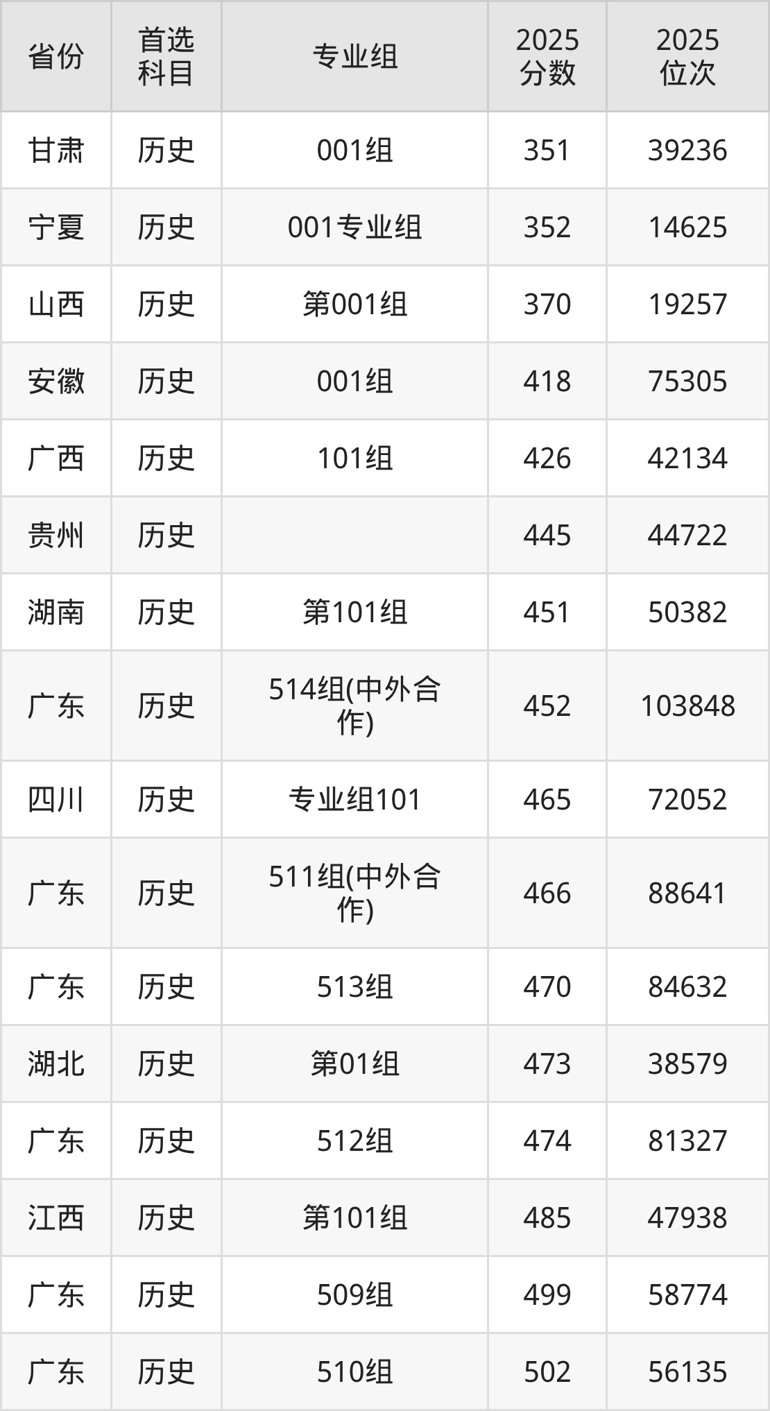 历史类:509组499分、58774名,510组502分、56135名,511组(中外合作)466分、88641名,512组474分、81327名,513组470分、84632名,514组(中外合作)452分、103848名;