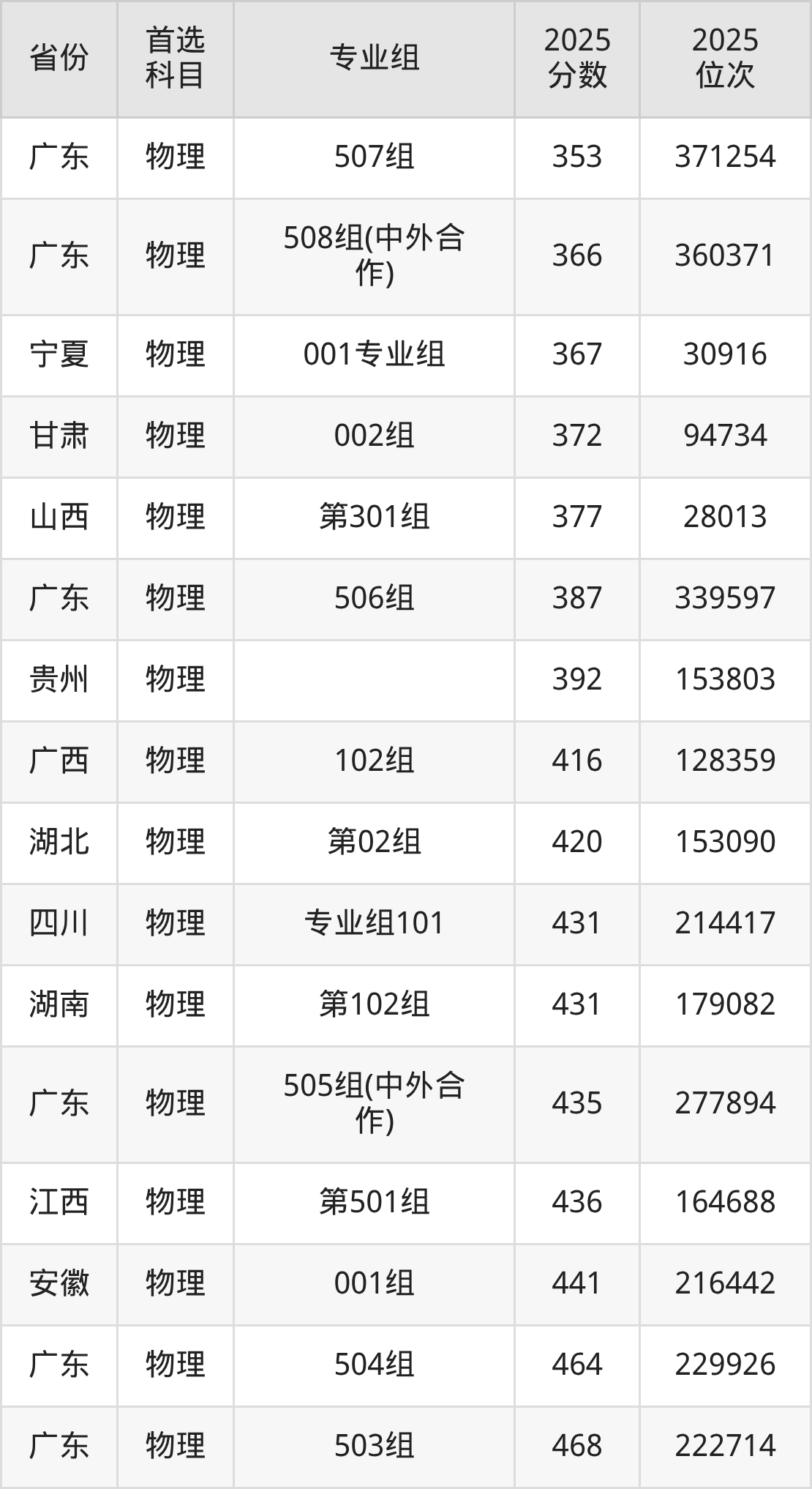物理类最低分对应地区为广东(507组),录取位次为371254,超专科线153分;最高分对应地区为广东(203组),录取位次为106831,超本科线97分。